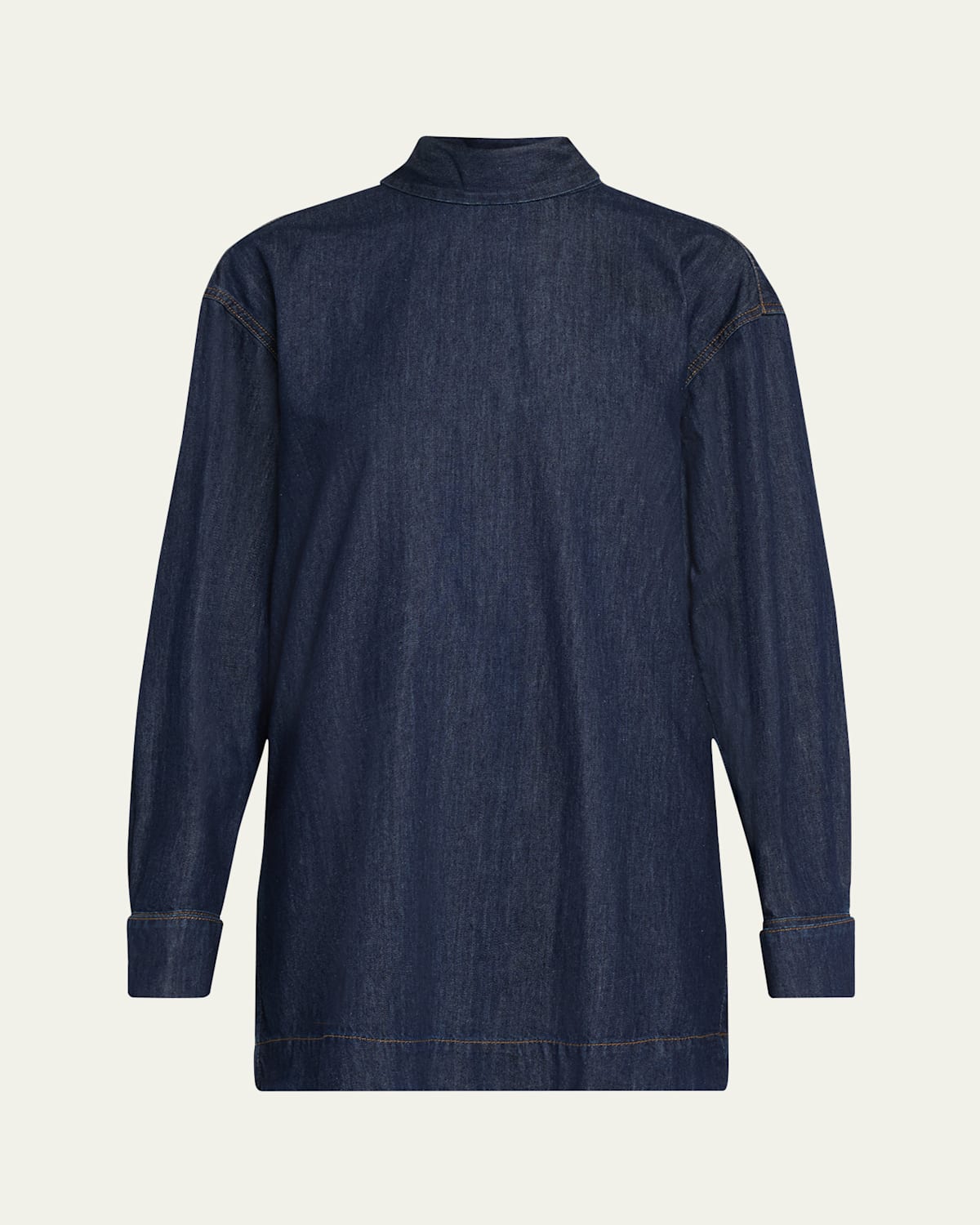 Crafted from nonstretch denim in a classic, darkwash silhouette, the "Chaddy" blouse by Dries Van Noten features a selftie collar that can be tied in the front or back for versatile styling High neckline Dropped shoulders Long sleeves; button cuffs Yoked back Loose fit Tunic length Cotton Made in Belgium