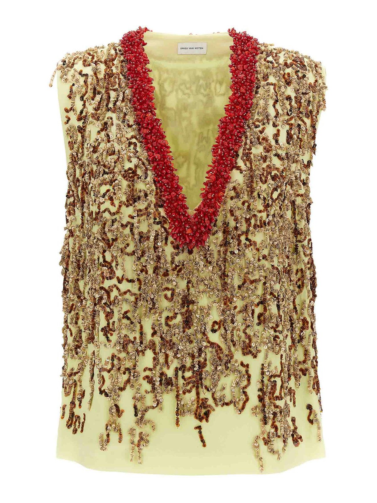 chemise d'université en soie avec application de paillettes sur l'ensemble pour former des franges, col en V avec application de perles, sans manches.