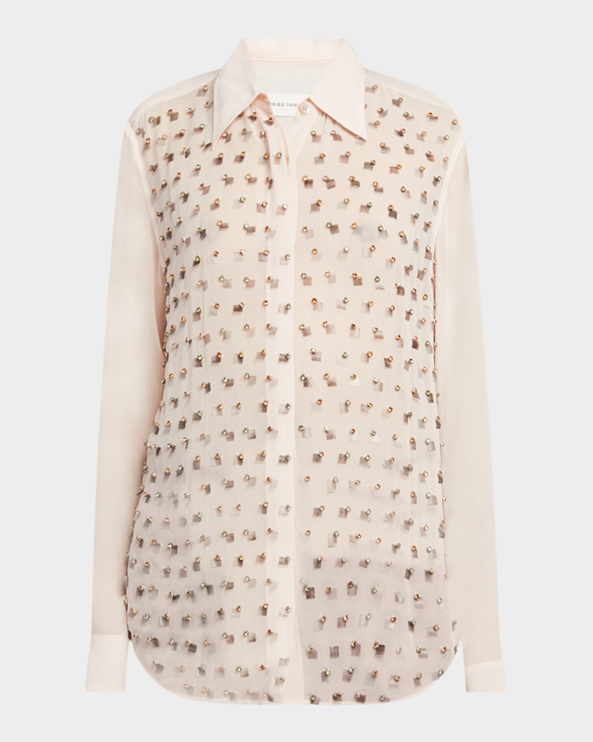 Crafted from a sheer, lightweight fabric, the "Chowy" blouse by Dries Van Noten is adorned with cubelike metallic embellishments arranged in a neat grid for added depth and subtle shimmer Shirt collar; concealed placket Long sleeves; button cuffs Yoked back Relaxed fit Hip length Viscose Imported