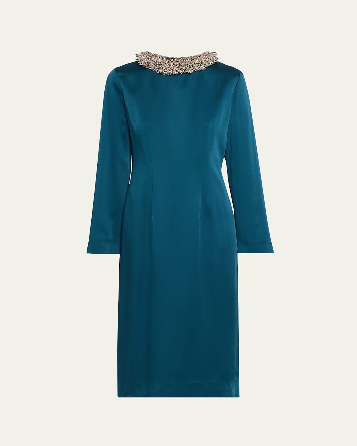 Dries Van Noten "Danora" satin dress finished with an embellished collar Crew neckline Long sleeves with button cuffs Sheath silhouette Hem falls below the knee Center back zip Acetate/viscose Dry clean Imported