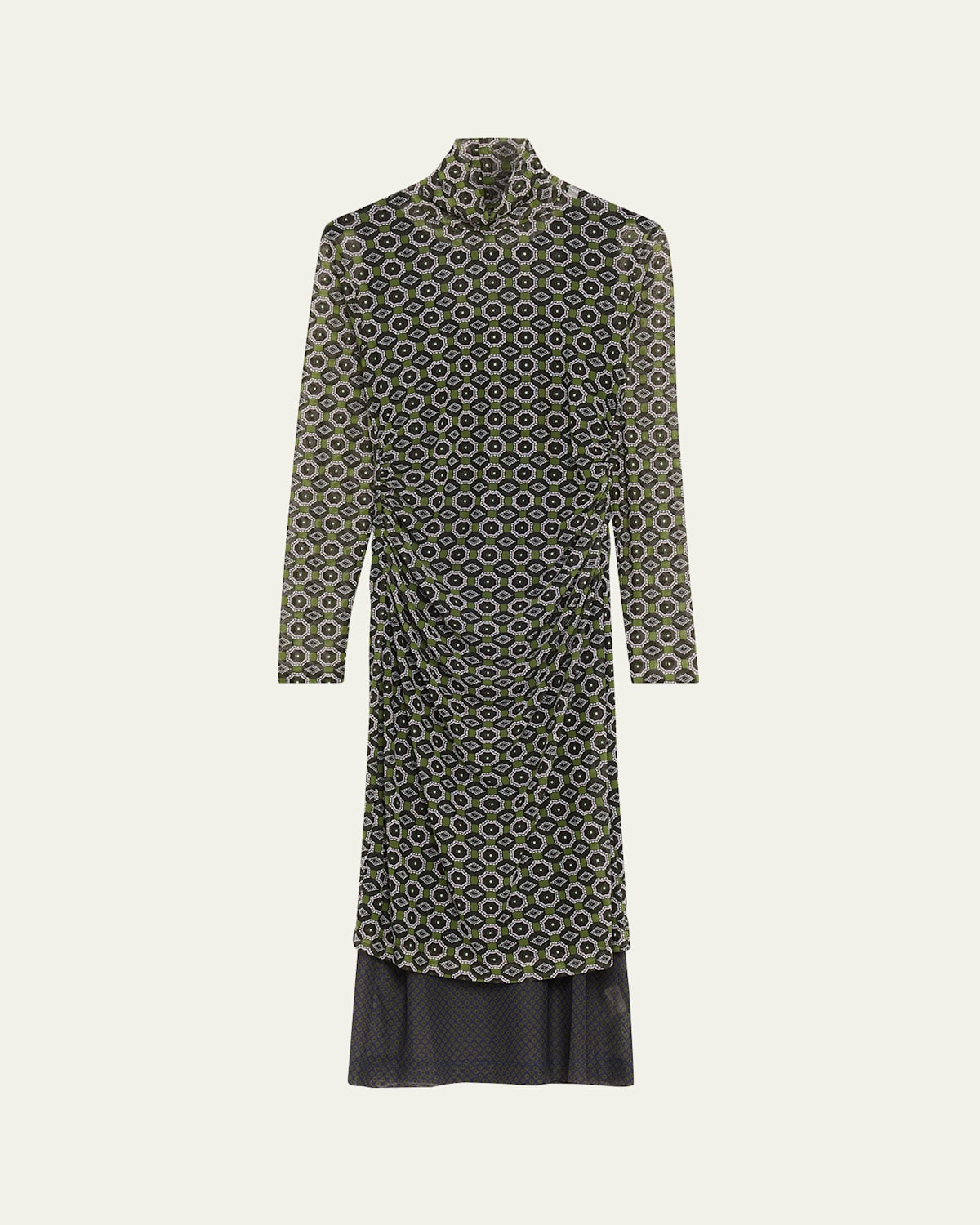 Dries Van Noten "Hofes" dress crafted of printed sheer mesh with ruching in the back Turtleneck Long sleeves Figurehugging silhouette Hem falls below the knee Slipover style Nylon/polyamide/elastane Imported