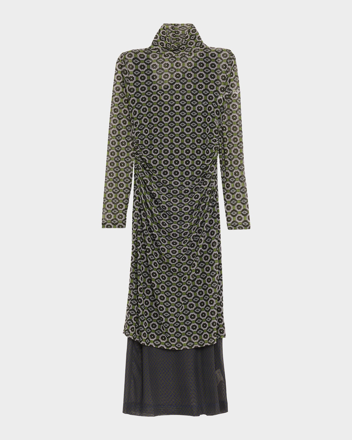 Dries Van Noten "Hofes" dress crafted of printed sheer mesh with ruching in the back Turtleneck Long sleeves Figurehugging silhouette Hem falls below the knee Slipover style Nylon/polyamide/elastane Imported