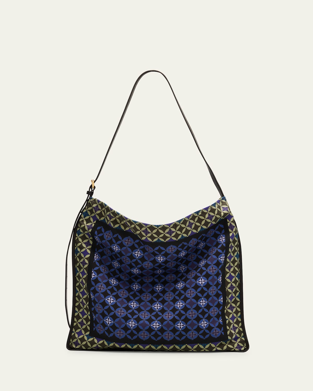 Dries Van Noten geometric scarfpatterned hobo bag in cotton, viscose, and leather Adjustable shoulder strap Open top Interior, attached ziptop pouch Lining: Viscose Approx. 16.1"H x 15.4"W x 1"D Imported