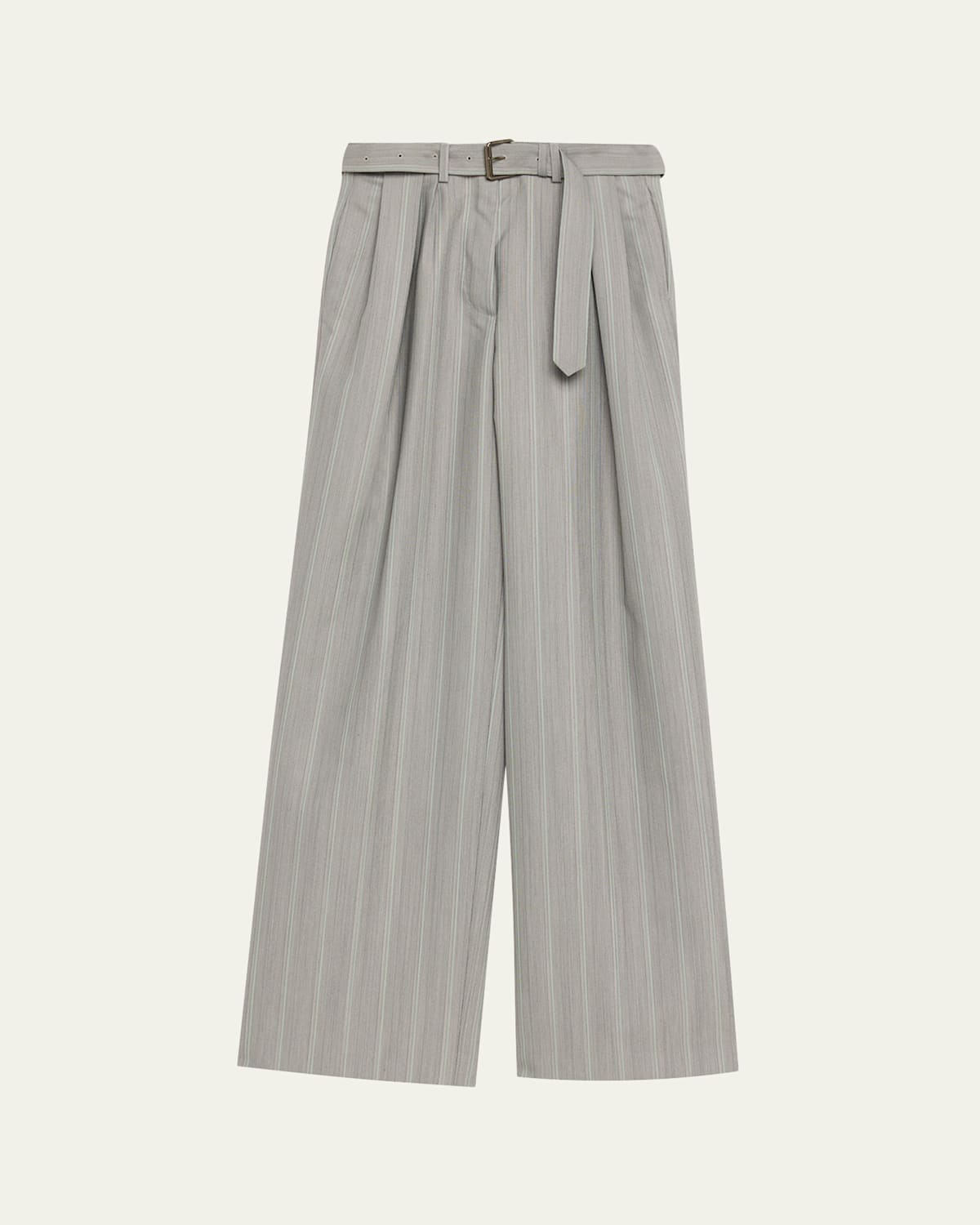 Dries Van Noten "Peaches" pinstripe pants crafted in a luxurious blend of wool and silk adorned with a self belt High rise Pleated front Side slip pockets Back welt pockets Wide legs Full length Button/zip fly; belt loops Wool/polyester/silk Dry clean Imported