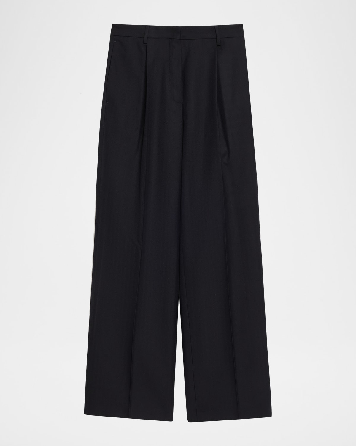 Dries Van Noten "Portias" pants tailored in a herringbome wool High rise Pleated front Side slip pockets Back welt pockets Straight legs Full length Hook/zip fly; belt loops Wool Imported