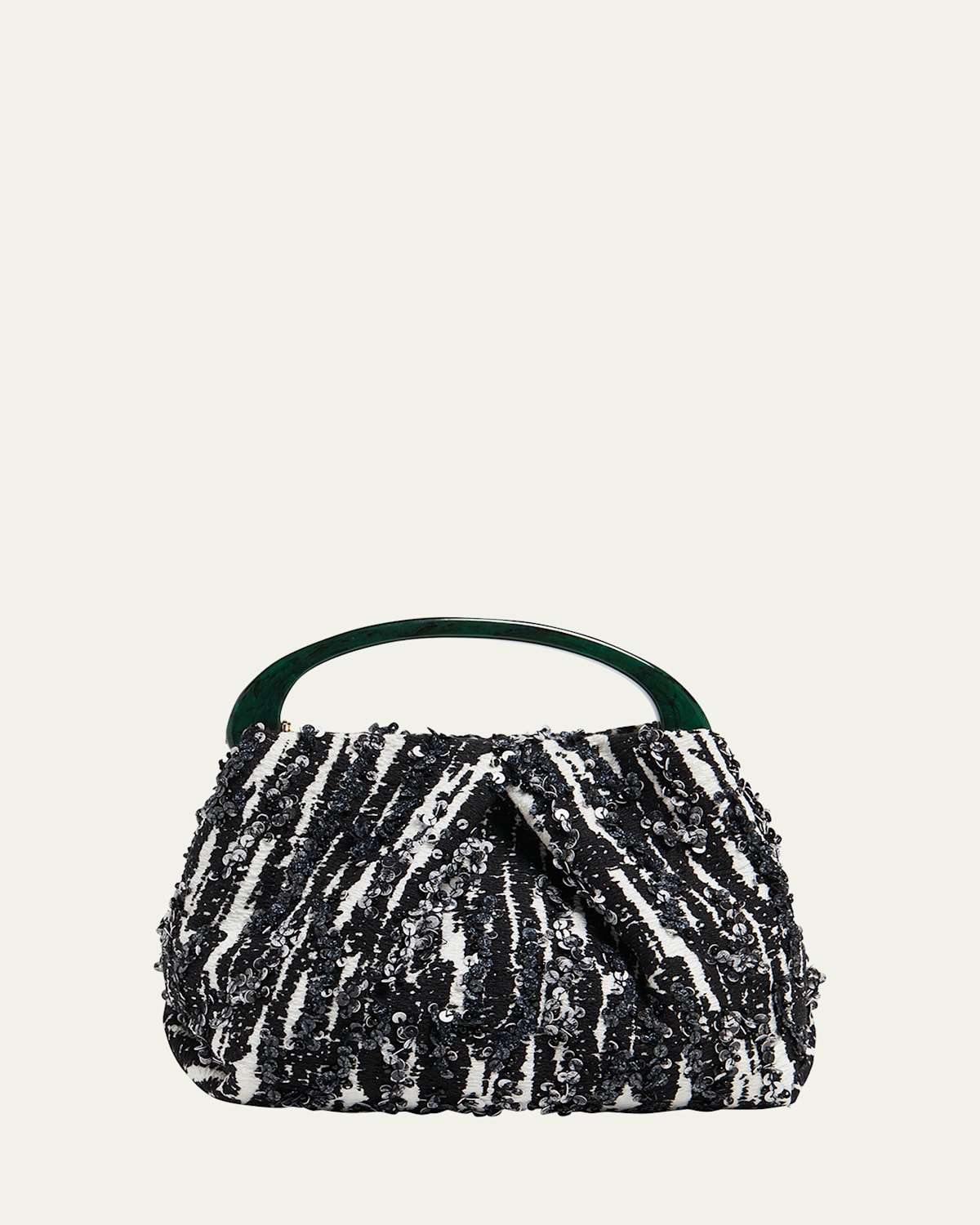 Dries Van Noten mini crossbody bag in textured zebrapatterned viscose jacquard with leather details Embellished with glittering sequins and elegant pleats Resin top handle Detachable shoulder strap Can be work as a top handle or shoulder strap Open top with magnetic closure Interior, one slip pocket Approx. 6.7"H x 7.9"W x 3.5"D Imported