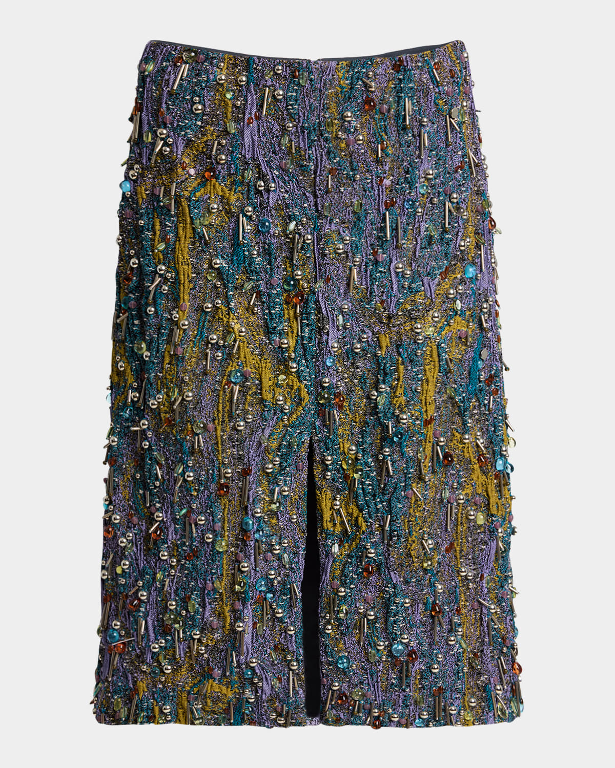 Dries Van Noten "Shera" embellished skirt with multicolor threading High waist Midi length Straight silhouette Front walking vent Back zip Cotton/viscose/polyester Imported