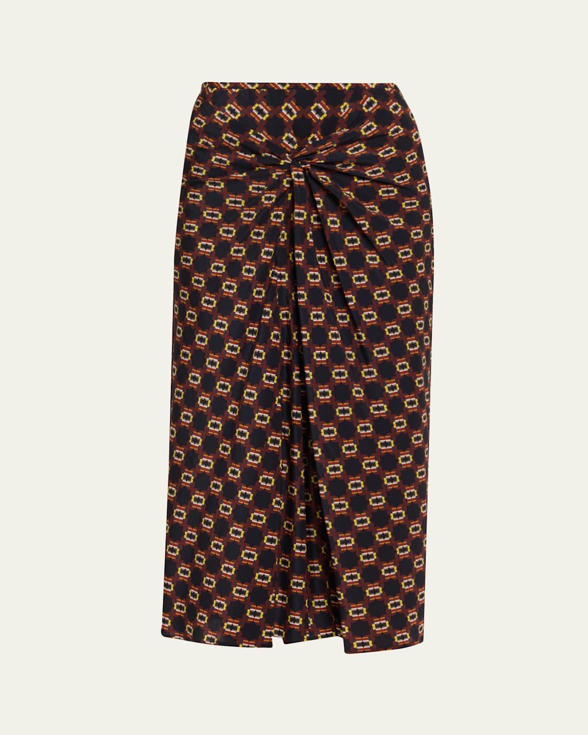 Composed of lustrous silk for a fluid drape, the "Smila" skirt by Dries Van Noten boasts an allover signature print and flattering front knot detail High waist Hem falls below the knee Aline silhouette Side zip closure Silk Made in Poland