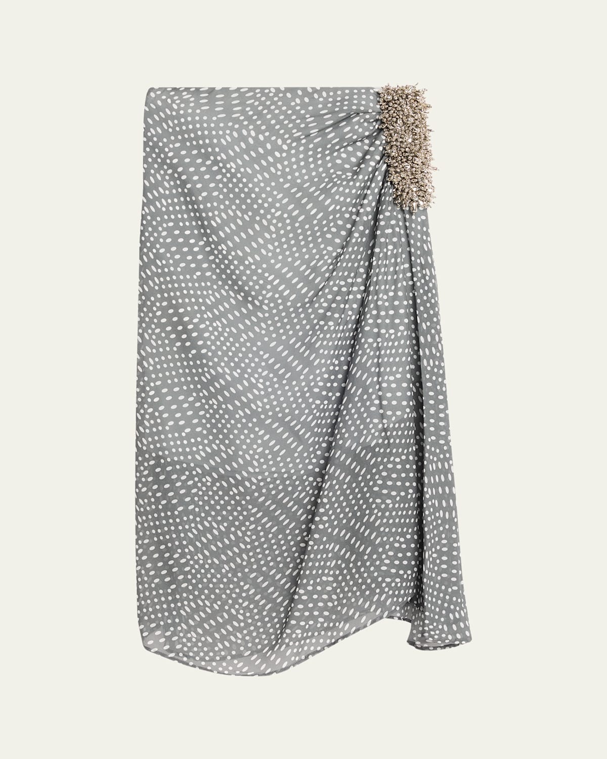 Dries Van Noten "Sovora" skirt is crafted of polkadot printed flowy viscose and features a faux wrap silhouette with a gathered waist embellished with bead embroidery Mid waist Skirt falls straight from hip to hem Knee length Hidden closure Viscose Made in Portugal