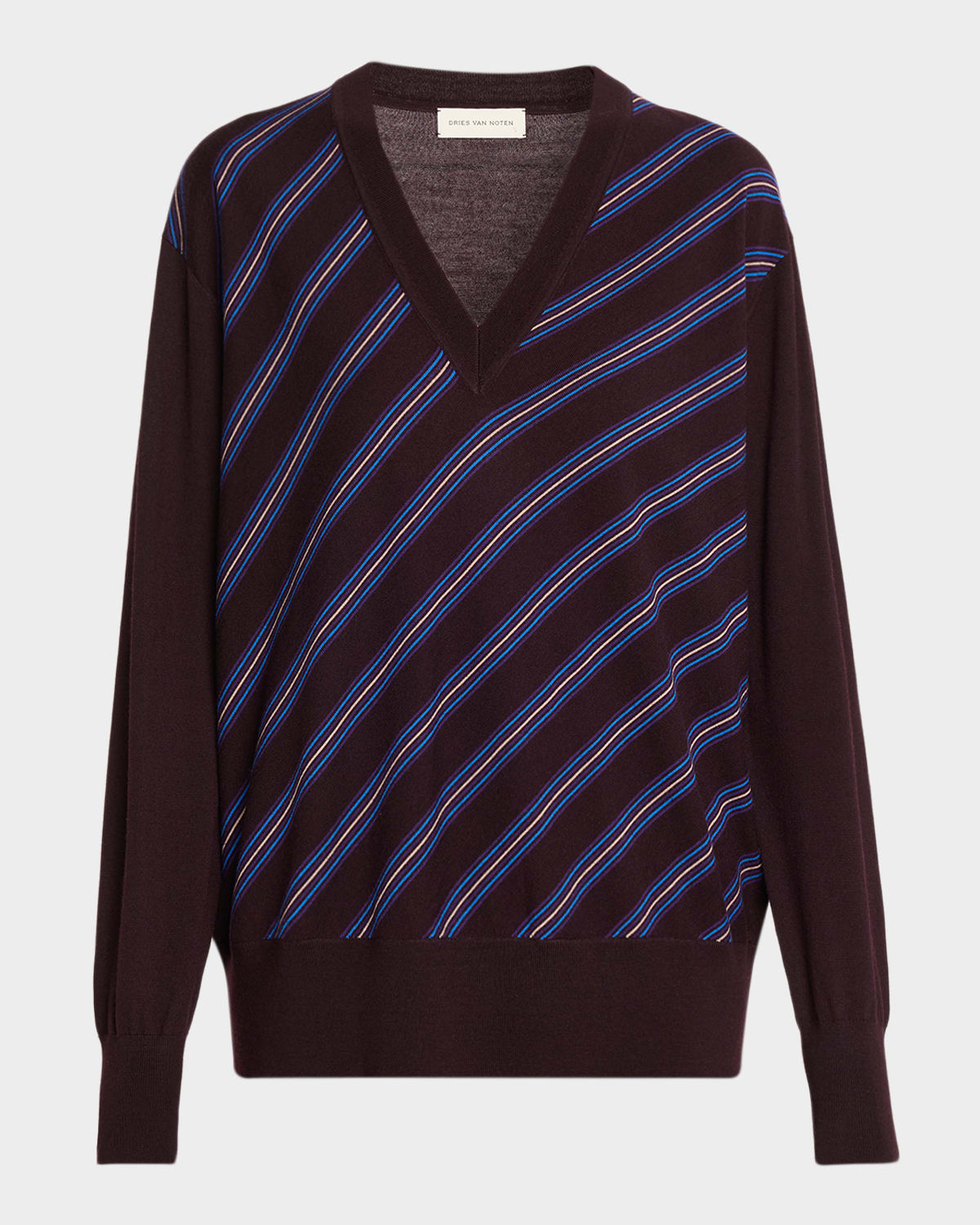 Composed of solid wool, the "Tishana" sweater by Dries Van Noten features a diagonal multistriped front panel V neckline Dropped shoulders Long sleeves Relaxed fit Hip length Pullover style Wool Imported