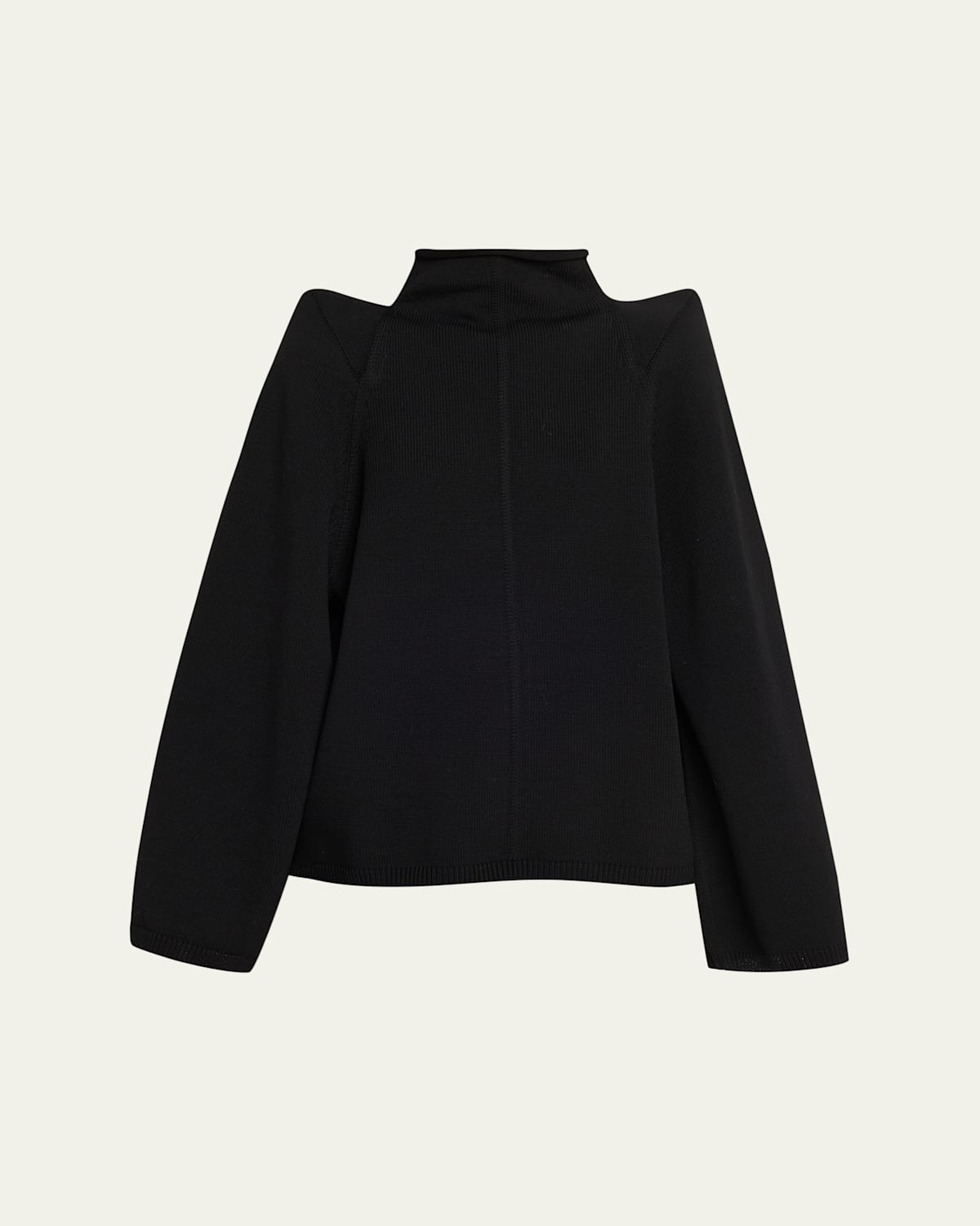 Framed with firmly shaped, strong shoulders, this sweater by DRKSHDW RICK OWENS offers an elevated version of a classic wardrobe staple Slight funnel neckline Flared long sleeves Signature knit channel running down the spine Relaxed fit Hip length Pullover style Wool Made in Italy