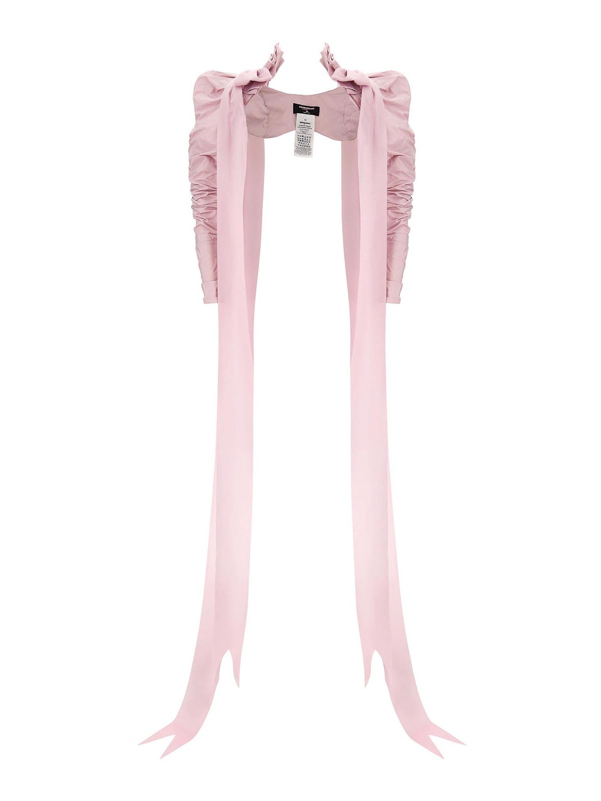 Haussement d'épaules Marie Antoniette Vaquera dsquared2 en effet organza avec ourlet brut, manches longues avec fermeture éclair sur les poignets et épaules pointues, nauds avec longue traîne