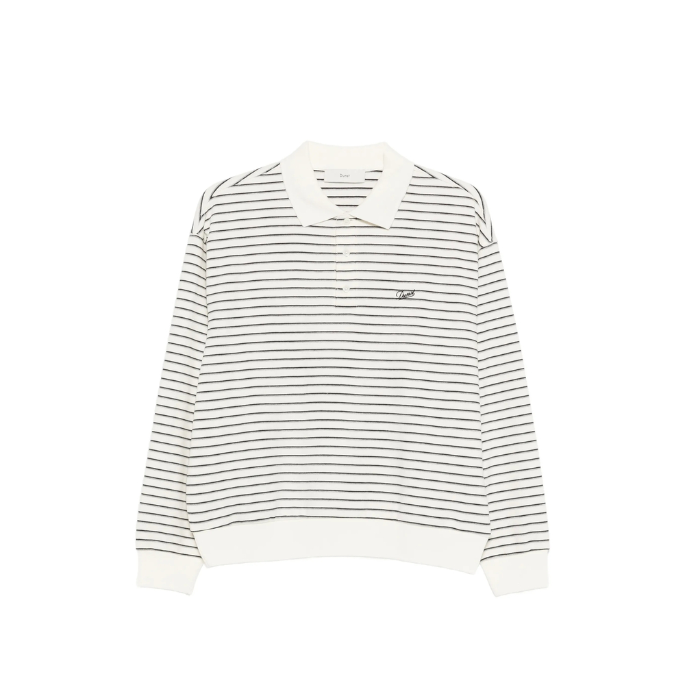 beige striped front button placket polo collar long sleeves logo embroidery