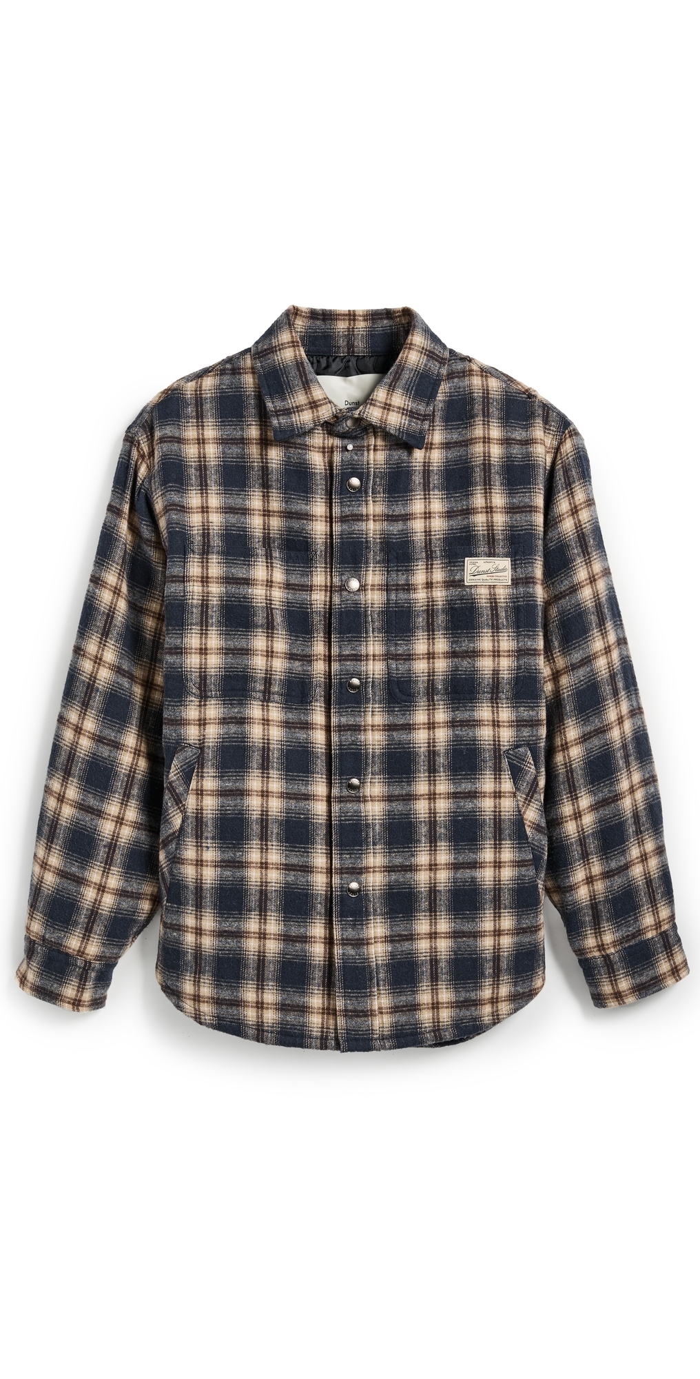 Fabric: Mid-weight, non-stretch flannel. Plaid pattern. Logo patch at chest. Collared neck. Long sleeves with snap cuffs. Snap placket. Welt and patch front pockets. Patch interior pockets. Shell: 67% polyester/27% cotton/5% rayon/1% other fibers. Lined. Lining: 100% polyester. Fill: 100% polyester. Dry clean. Imported, Vietnam. Measurements: Measurements from size XS Length: 22.75in / 58.0cm, from shoulder