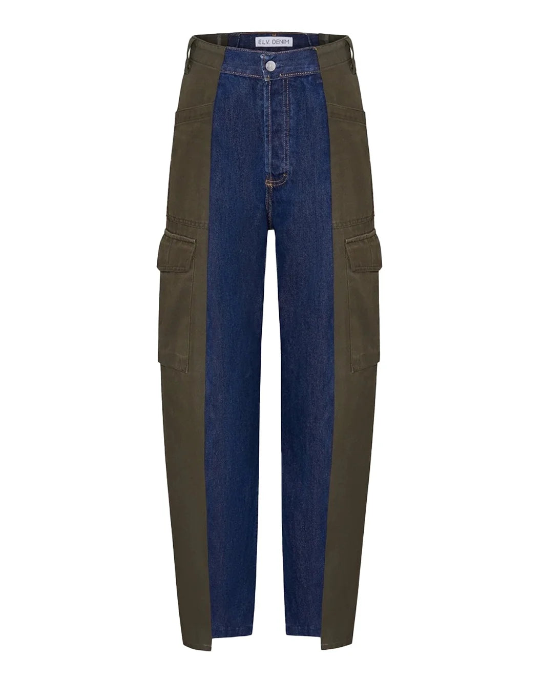 The Irenie Trousers Cargo in the colors Khaki& Dark Blue by E.L.V. is a high-waisted, contrast cut cargo and denim pant that features functional cargo pockets, asymmetrical cut hems, middle seam detailing and a lightly tapered fit. Your perfect fall trouser with an edgy twist. Material: Handcrafted from rigid denim and classic cotton cargo trousers. Details: Zip Closure. Fit: Boyfriend fit. True to size. Size up for a more relaxed fit that sits lower on the hip. Sizing: Song is 5'7" wearing size 27. Style it with: A flannel or baggy t-shirt for an edgy but casual look. Upcycled trousers are each one of a kind and may have slightly different characteristics than what is pictured. Care: Wash at 30°C maximum. Air dry. #1110722943/06