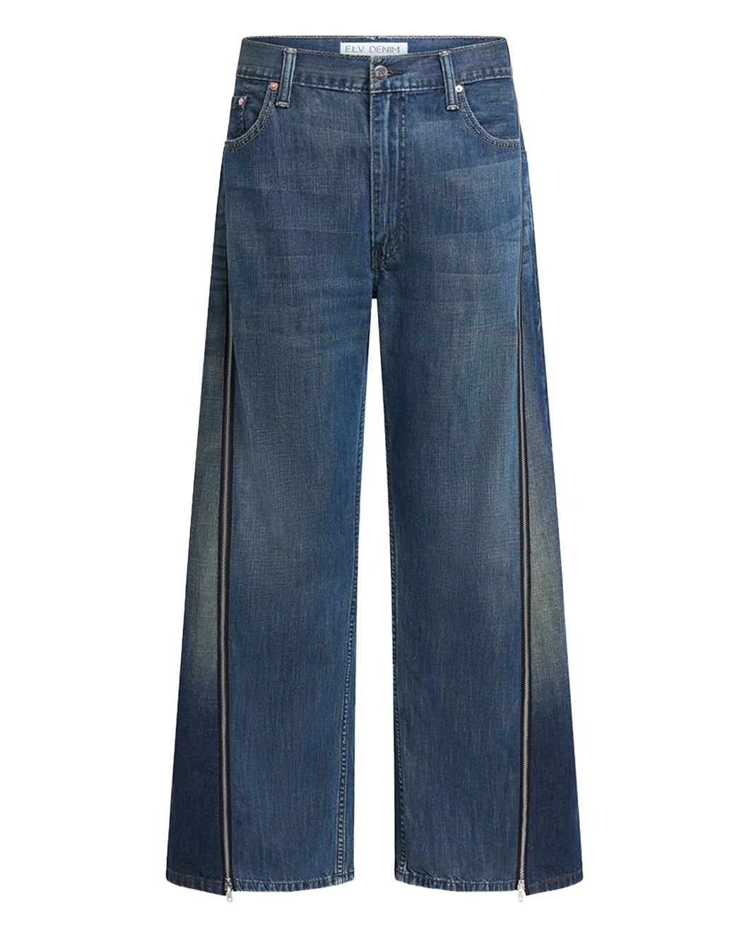 The Siouxie Wide Leg Zip Jeans in the color Dark Blue by E.L.V. is a low-waisted, contrast cut denim jean that features open ended metal zippers along the seam, a true wide leg fit, and made from rigid denim with a lived-in feel. Your perfect detailed wide leg jean for fall. Material: Handcrafted from two pairs of vintage jeans. Details: Zip Closure. Fit: True to size. Size down for a more high waisted fit. Sizing: Cali is 5'8" wearing size 26, Nis is a 5'7" and wearing a size 26 Style it with: A fitted tank or slouchy t-shirt and sneakers for a casual look. Upcycled jeans are each one of a kind and may have slightly different characteristics than what is pictured. Care: Wash at 30°C maximum. Air dry. Extra Length- 33 inch inseam. Tall offered in 27,28 & 29. #10142102