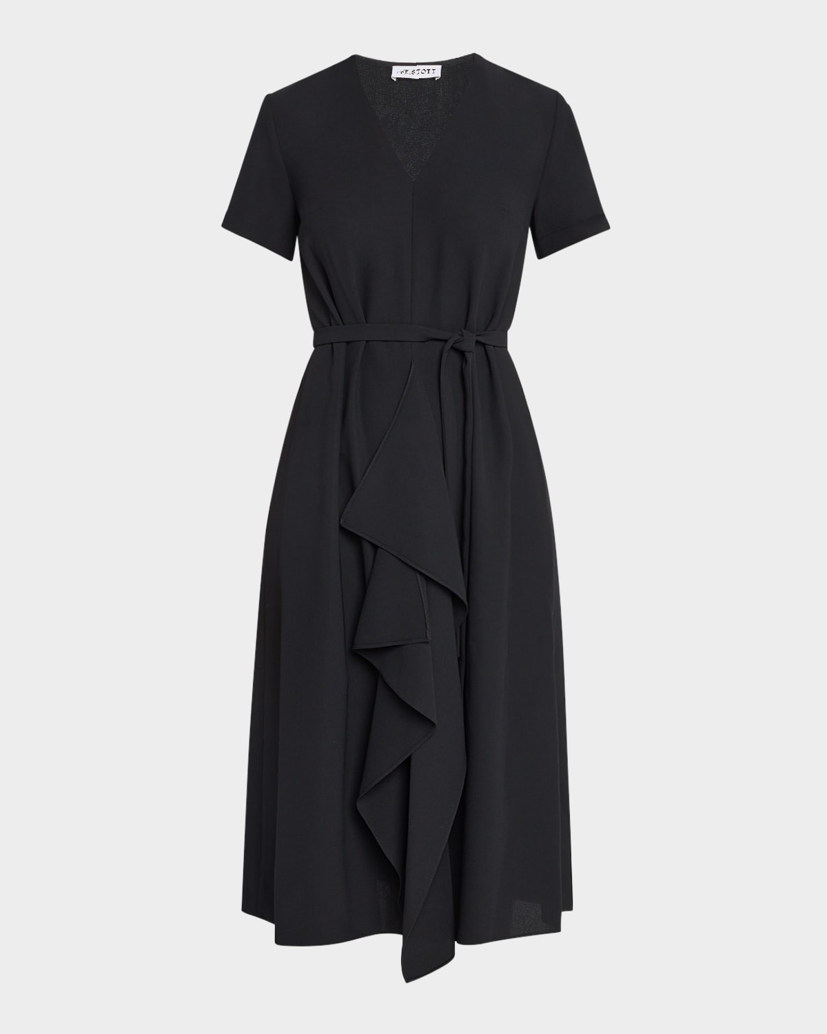 E.Stott "Dylan" midi dress with a front cascading ruffle Approx. 48"L from shoulders to hem V neckline Short sleeves Waist selftie Hem falls below the knee Aline silhouette Polyester Made in United Kingdom