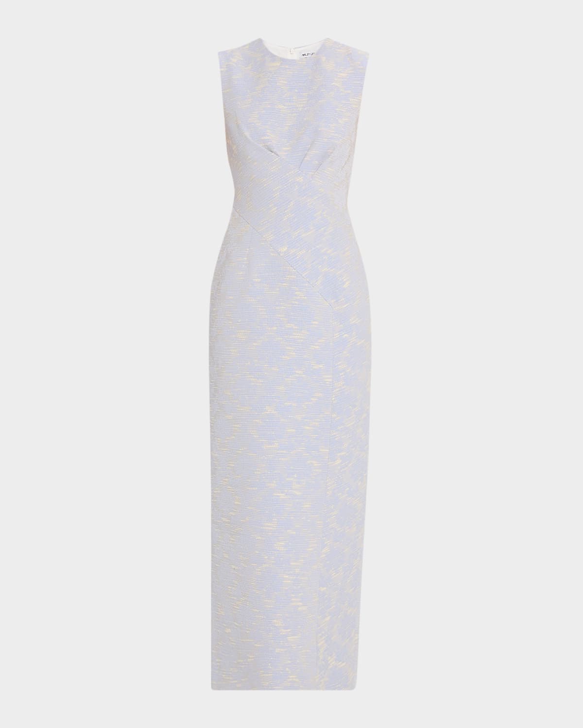 E.Stott "Lucia" maxi dress in boucle tweed with pleated front Jewel neckline Sleeveless Center back slit Ankle length Column silhouette Invisible back zipper Polyester Made in the United Kingdom