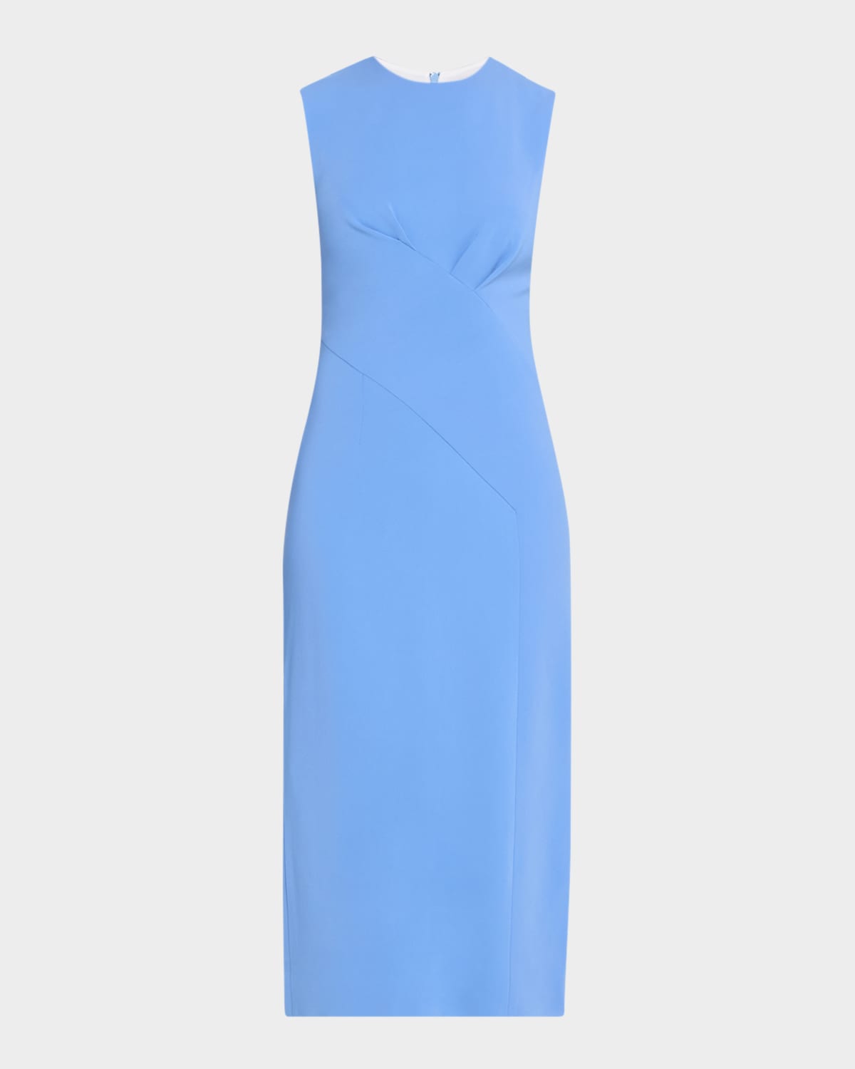 E.Stott "Mila" midi dress with crossover front Approx. 48.5"L from shoulders to hem Jewel neckline Sleeveless Center back slit Hem falls below the knee Column silhouette Invisible back zipper Polyester Made in the United Kingdom