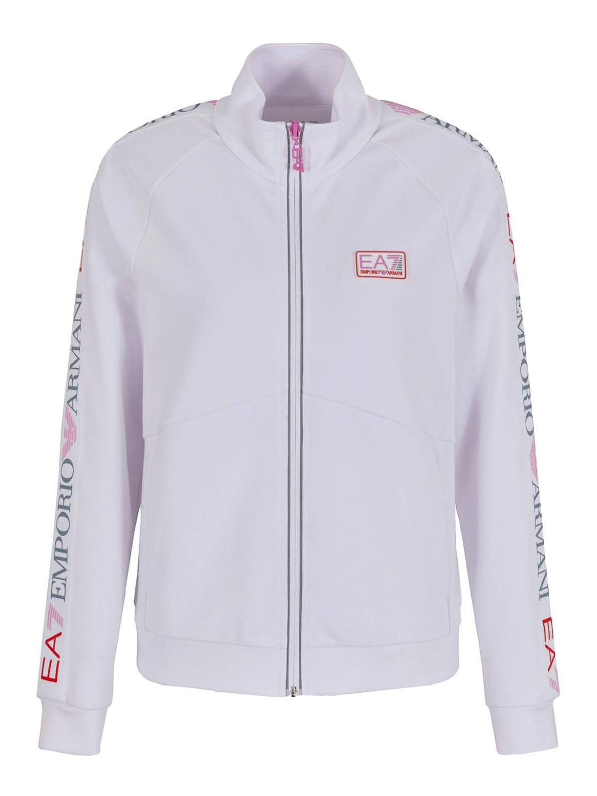 Logo blanc multicolore à motif extensible appliqué, logo imprimé sur le col montant, fermeture éclair de marque, ourlet droit