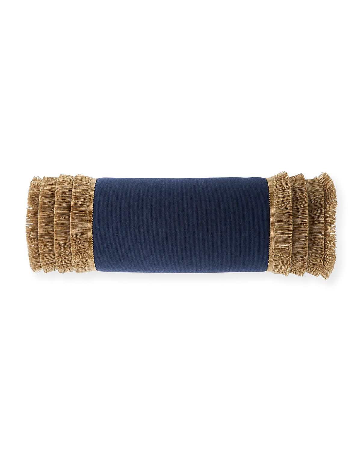 Bolster pillow is made of Sunbrella® acrylic Size: 24"L x 9"W x 9"D Solid blue fabric on ends Jute fringe edge finish Quickdrying polyester insert included Zipper closure for easy of care Spot clean only Made in USA