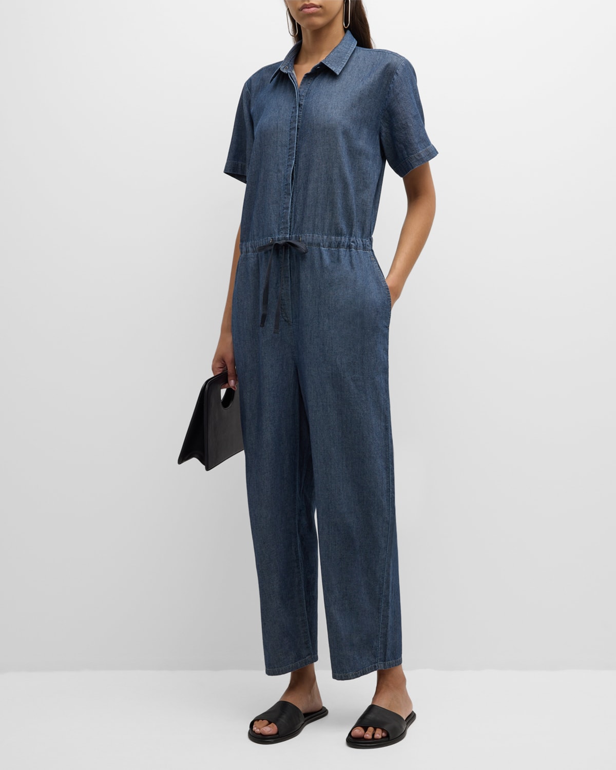 Eileen Fisher jumpsuit in chambrayinspired organic cotton twill Point collar; concealed button front Short sleeves Drawstring waist selftie Side slant pockets Cropped at the ankle Wide legs Organic cotton Machine wash cold Imported