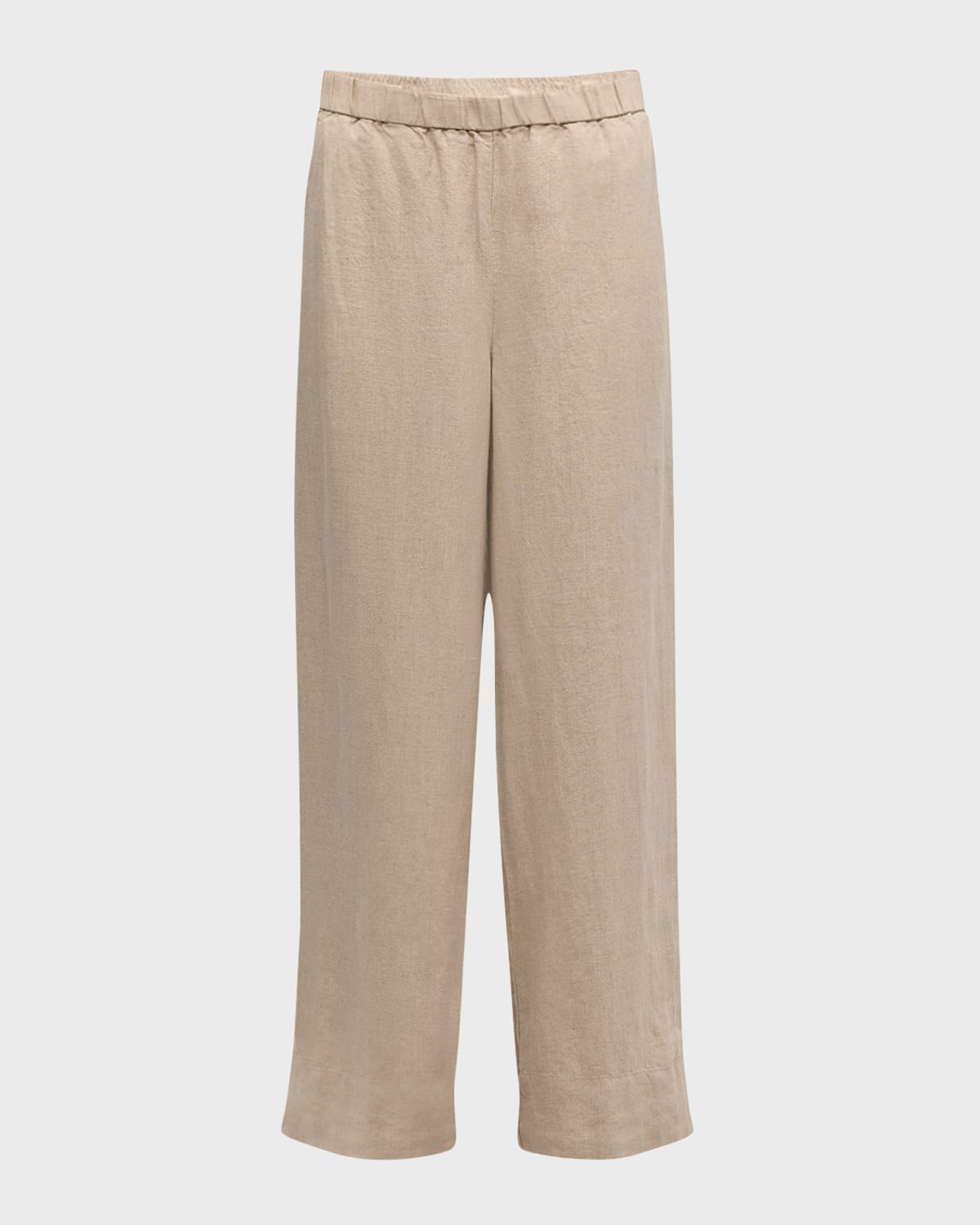 Eileen Fisher "Missy" mediumweight pants Approx. 29 1/2" inseam Elasticized waistband Side slip pockets Full length Mid rise sits high on hip Wide legs Slipon closure Organic linen Machine wash cold Imported
