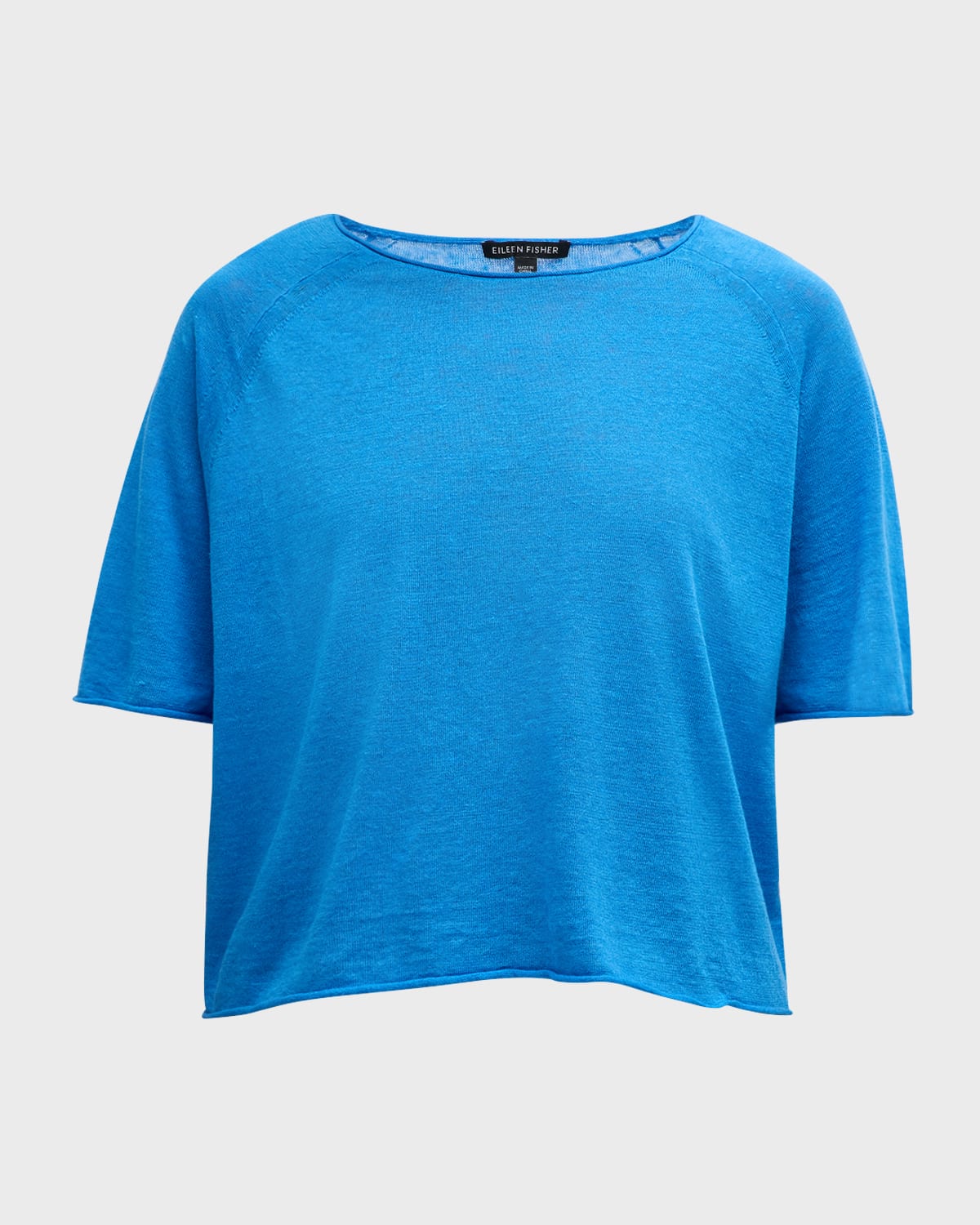 Eileen Fisher pullover in an organic linenorganic cotton knit Approx. 21"L from shoulders to hem Scoop neckline Elbow raglan sleeves Relaxed fit Pullover style Organic linen/organic cotton Hand wash Imported