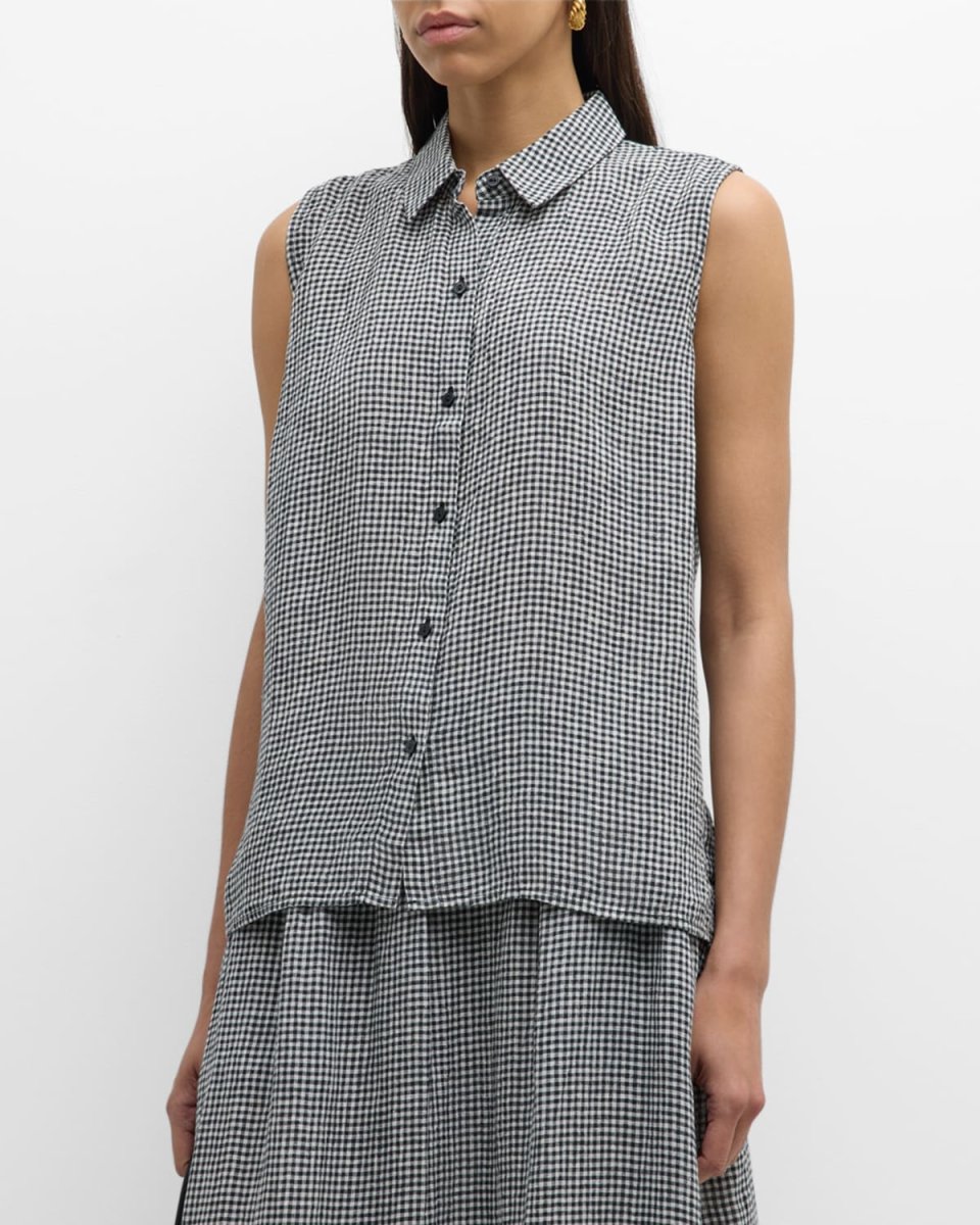Eileen Fisher shirt in a crinkled yarndyed check Approx. 25"L from shoulders to hem Point collar; button front Sleeveless Boxpleated back yoke Hem side slits Relaxed fit Organic linen Machine wash cold Imported