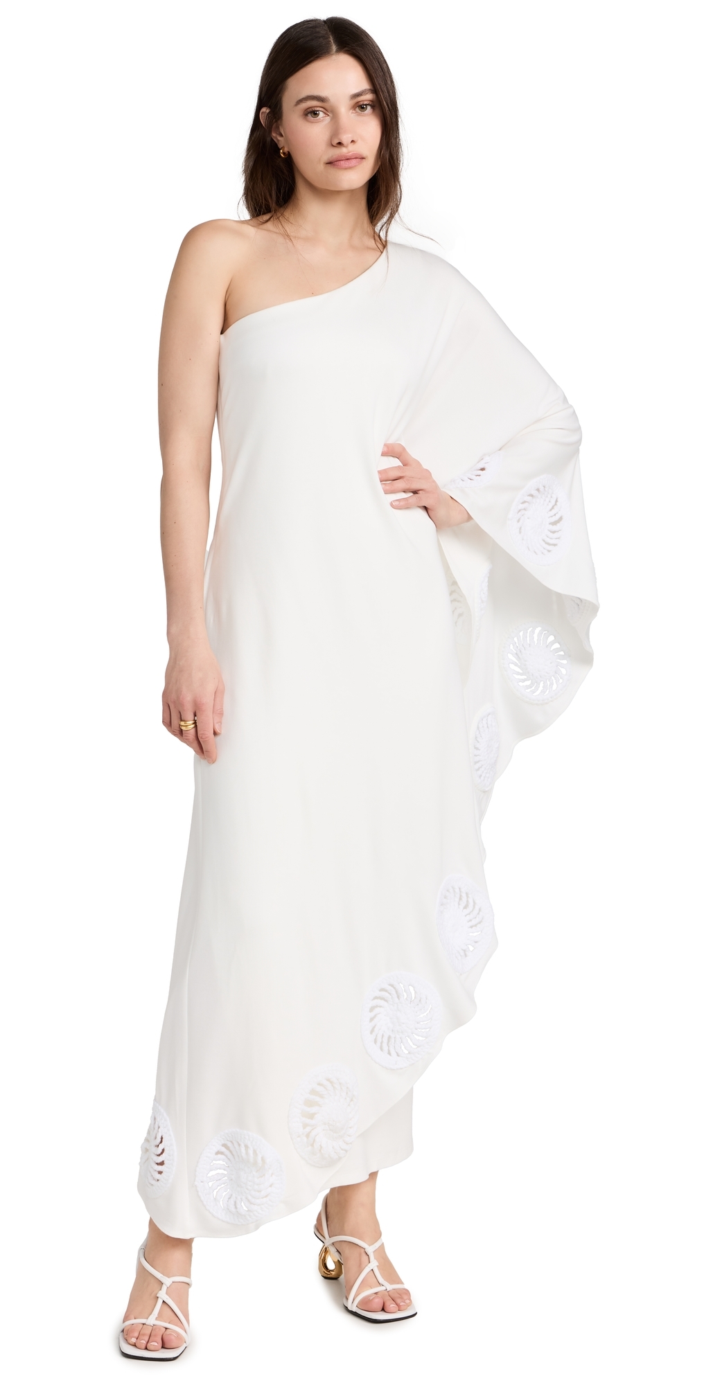 Fabric: Heavyweight jersey. Crochet details. One-shoulder neckline. Cape sleeve. Hidden zip at side. Shell: 62% viscose/33% nylon/5% spandex. Lined. Dry clean. Imported, China. Measurements: Measurements from size XS Length: 52.25in / 133.0cm, from shoulder to longest point
