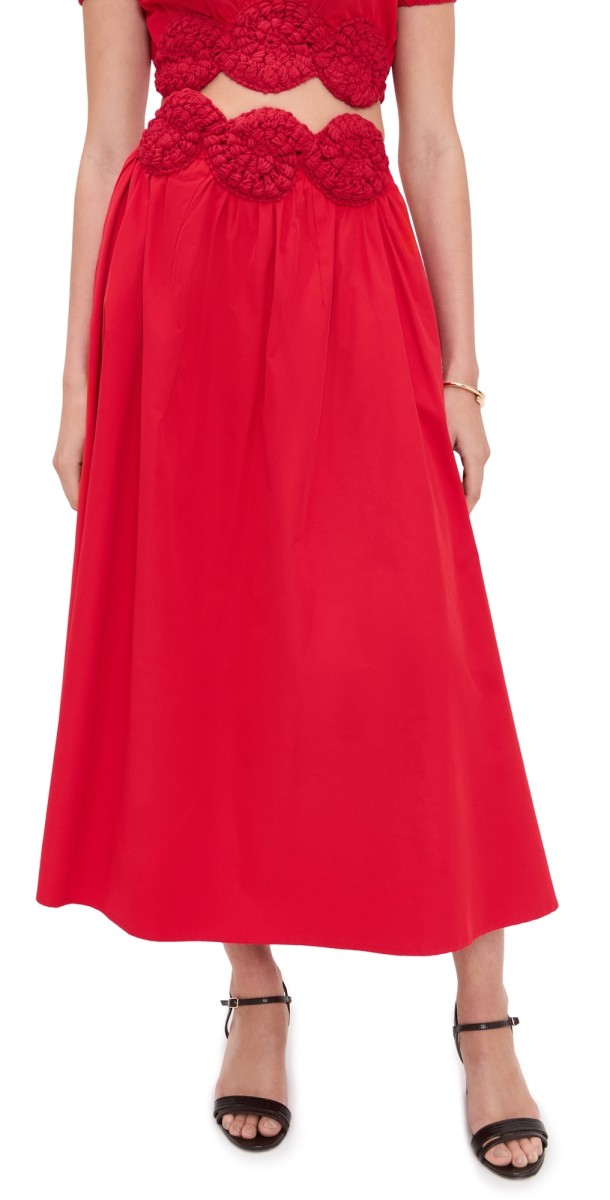 Fabric: Mid-weight, non-stretch weave. Crochet trim at waist. Midi length. Partial elastic waistband. Hidden zip at back. Slant hip pockets. Shell: 65% polyester/35% cotton. Lined. Lining: 97% polyester/3% spandex. Dry clean. Imported, China. Measurements: Measurements from size XS Length: 33.5in / 85.0cm