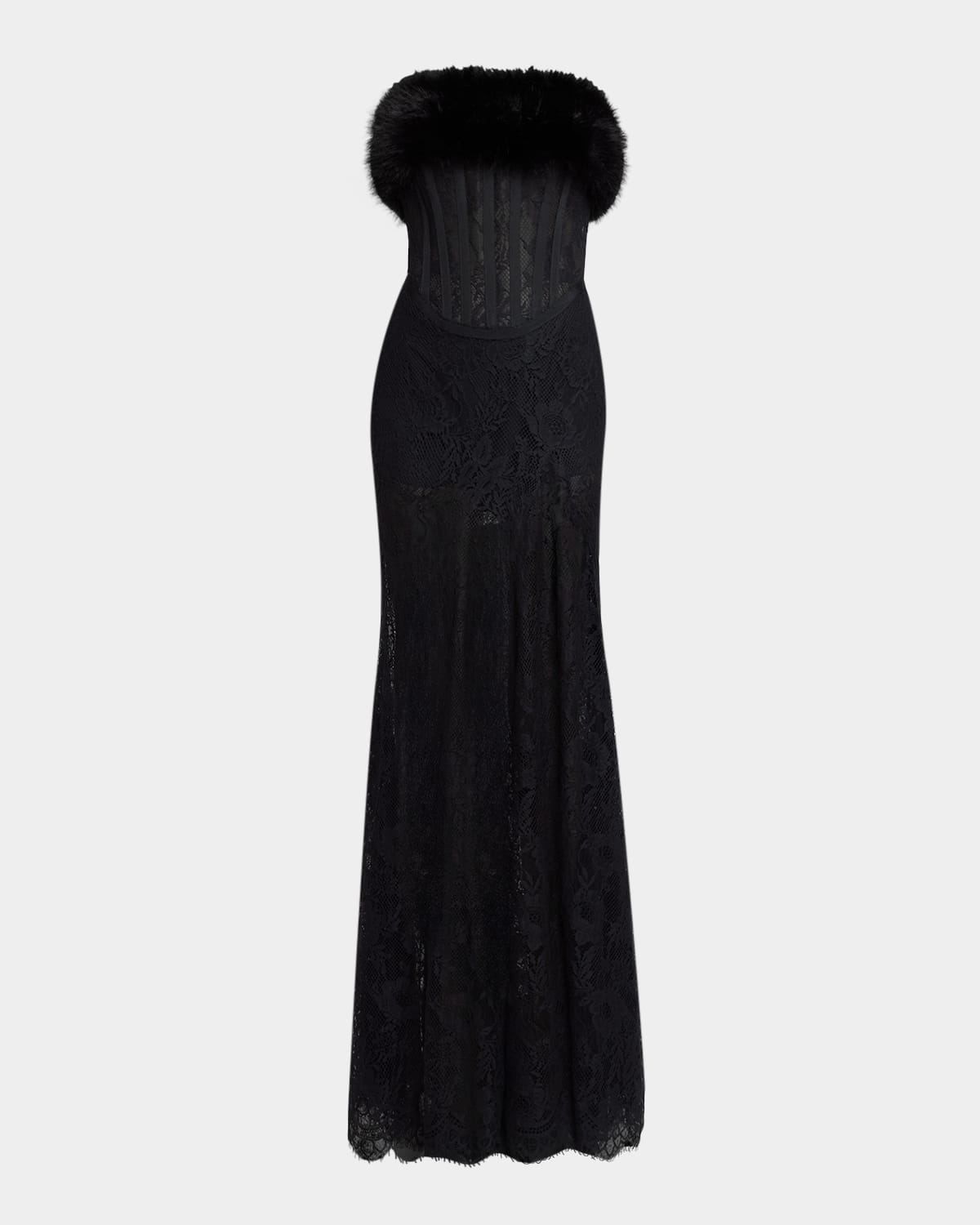 Elie Saab gown crafted of sheer lace with corsetry construction and faux fur (polyester) trim along the neckline Strapless neckline Sleeveless Aline silhouette Floor sweeping hem Scalloped hem Back zip Viscose/polyester Made in Italy