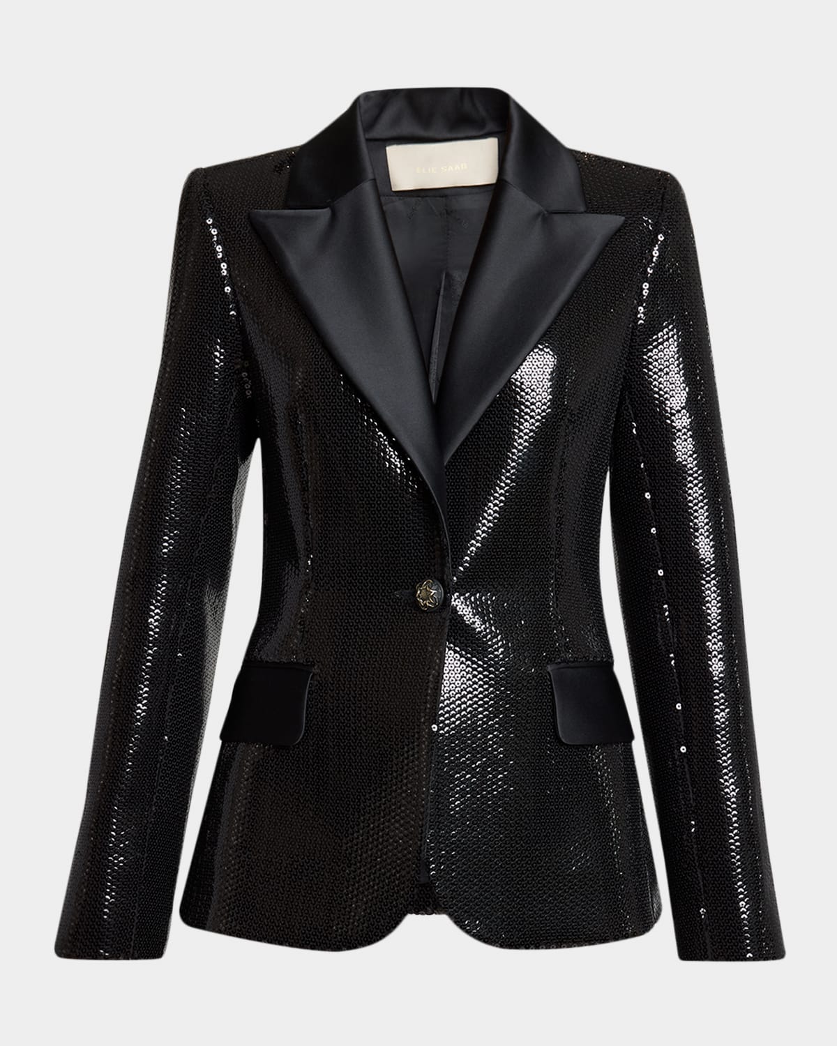 Elie Saab blazer jacket is tailored with allover sequin embellishment and satin lapels Peak lapels; singlebreasted front Long sleeves; button cuffs Padded shoulders Hip flap pockets Slim fit Hem falls below the hip Double walking vent back Silk/nylon/polyamide Made in Italy