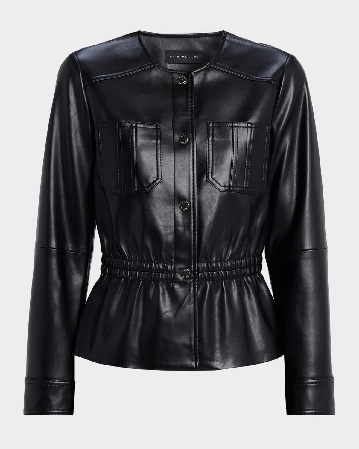 Elie Tahari "Aliza" faux leather jacket cinched by an elastic waist for a flattering fit Approx. 24.5"L from shoulders to hem Jewel neckline Long sleeves; approx. 24.5"L Two chest patch pockets Elasticized waistband Front snap closure Polyurethane/polyester Fully lined Machine wash cold Imported