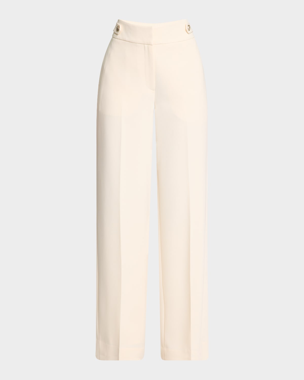 Elie Tahari "The Angelica" trousers with buttoned waist tabs Approx. measurements: 32" inseam; 43" outseam Highrise sits high on the hips Flat front Onseam pockets Full length Wide legs Zip fly Polyester/spandex Lining: Polyester Machine wash cold Imported