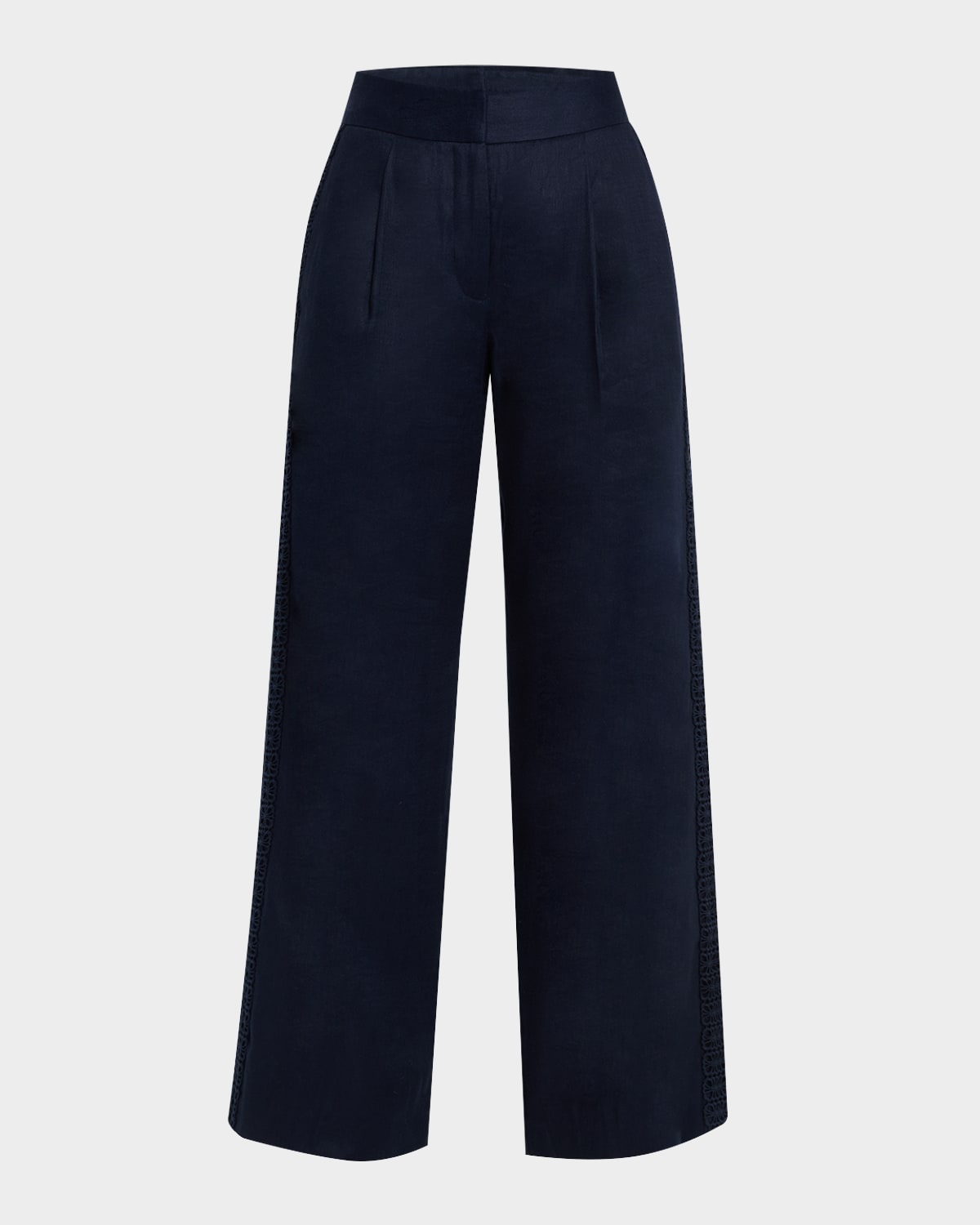 Elie Tahari "The Aster" pants trimmed with floral lace Approx. measurements: 31" inseam; 39" outseam Midrise sits high on the hips Pleated front Onseam pockets Full length Wide legs Zip fly Linen/viscose/spandex Lining: Cotton Dry clean Imported
