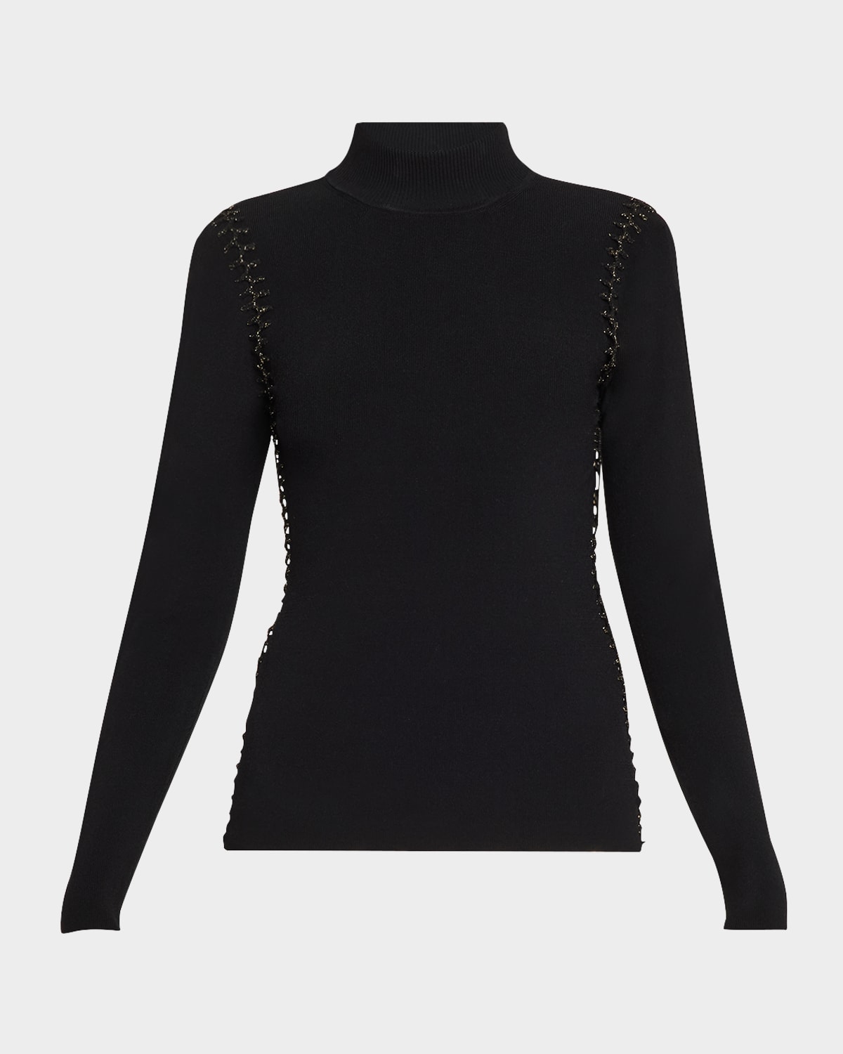 Elie Tahari "Azure" sweater framed by cross stitches Approx. 24"L from shoulder to hem Mock neckline Long sleeves; approx. 24.5"L Slim fit Pullover style Viscose/nylon/polyamide/polyester Hand wash or dry clean Imported