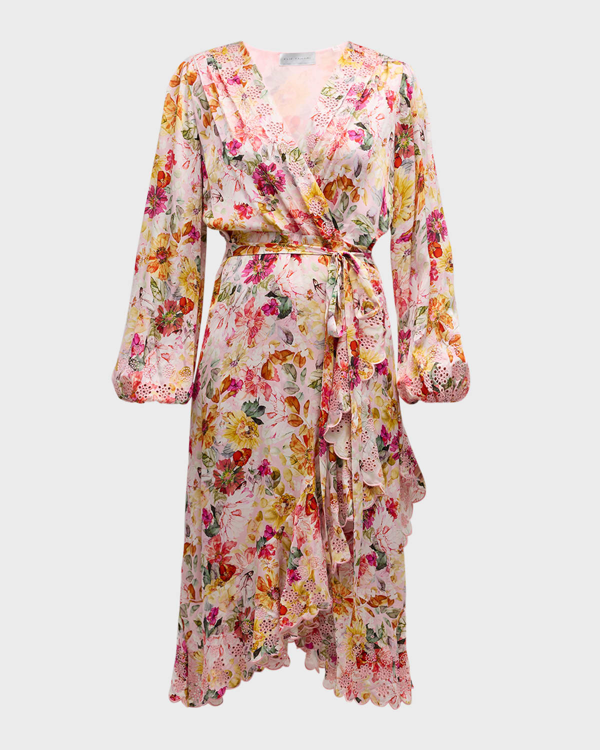 Elie Tahari "The Charlotte" fauxwrap midi dress in a floral print with eyelet embroidery and a scalloped ruffle hem Approx. 45"L from shoulders to hem Surplice neckline; wrap front Long blouson sleeves Highlow hem Hem falls below the knee Aline silhouette Silk/spandex Lining: Polyester Dry clean Imported
