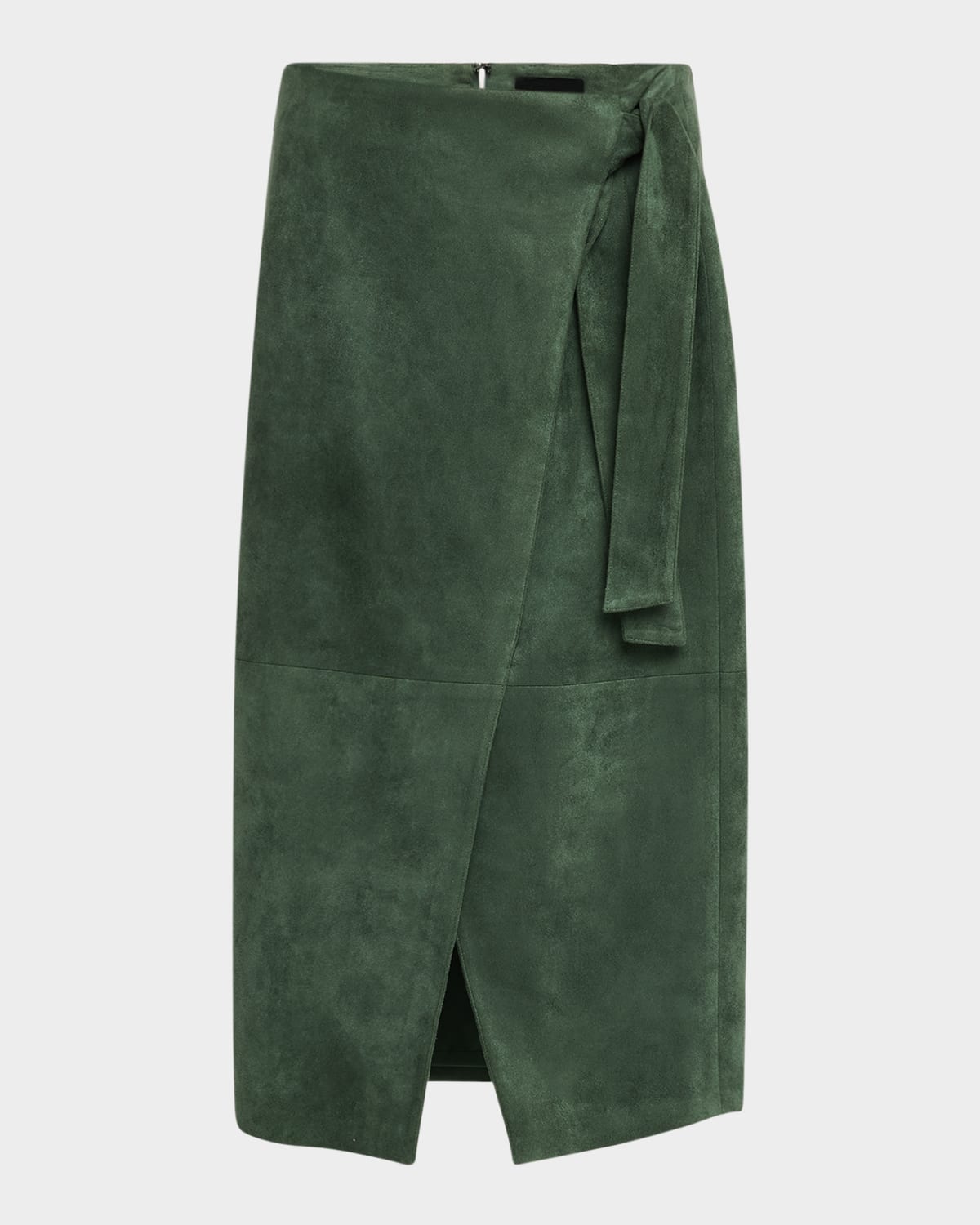 Elie Tahari "The Danica" midi wrap skirt in faux suede Sits high on the hips Side selftie Front slit hem; approx. 8"L Hem falls below the knee Skirt falls straight from hip to hem Invisible back zipper Polyester/spandex Lining: Polyester Machine wash cold Imported