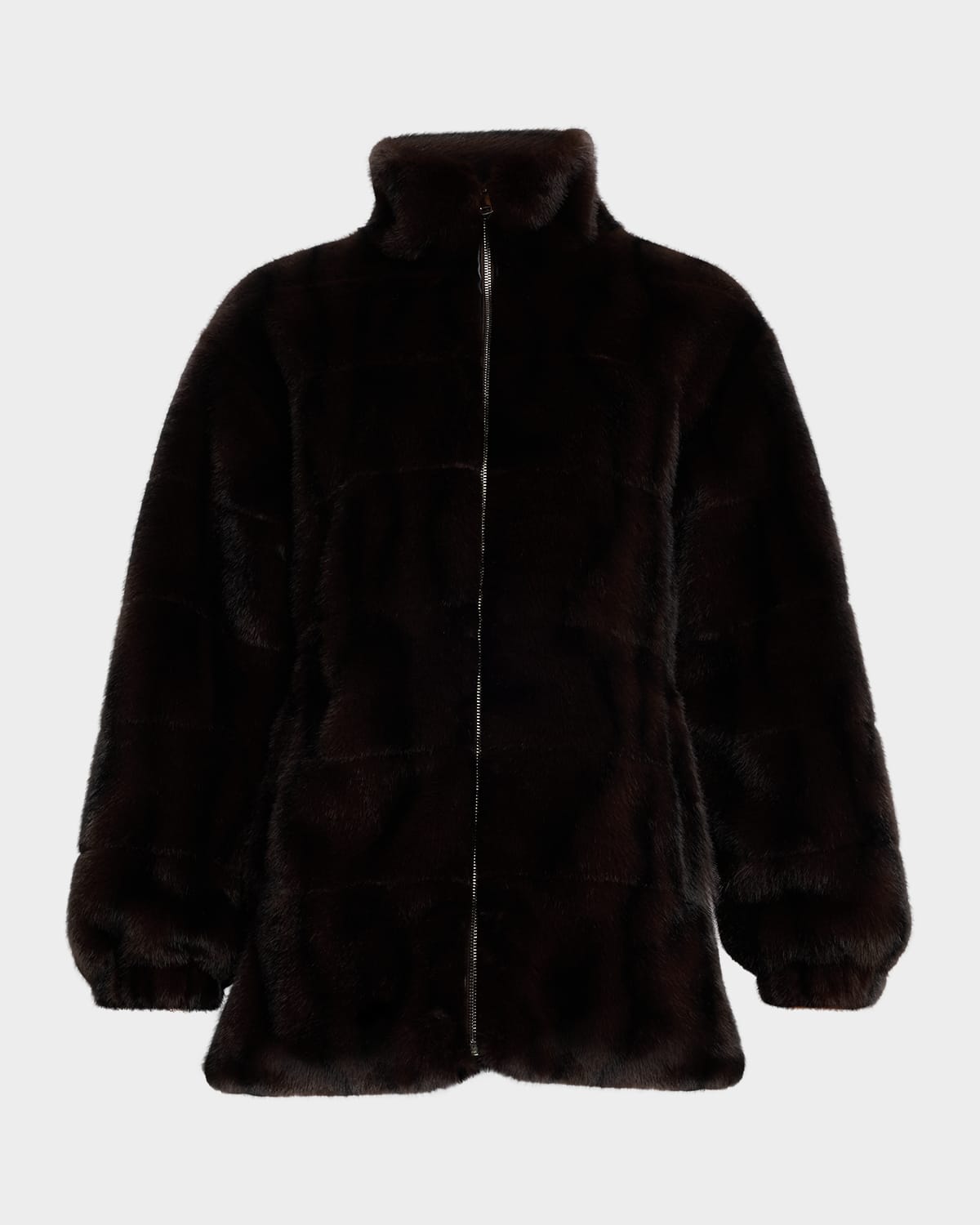 Elie Tahari "Eliana" cozy coat crafted of plush faux fur (polyester) Approx. 30.5"L from shoulders to hem Stand collar Long sleeves; approx. 22.0"L Elasticized cuffs Two side welt pockets Zip front closure Lining: Polyester Dry clean Imported