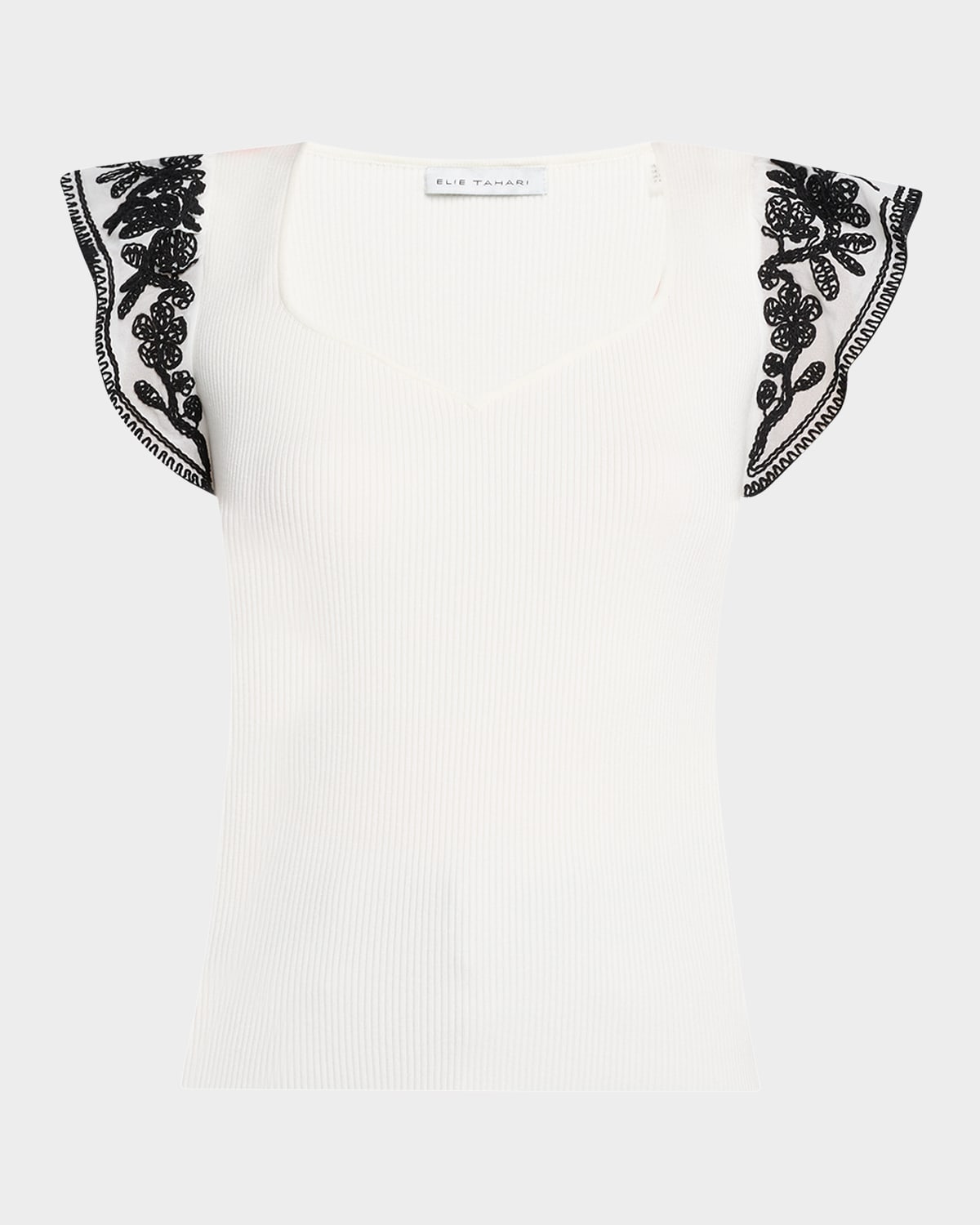 Elie Tahari "The Emily" sweater with contrast embroidered sleeves Approx. 23"L from shoulders to hem Queen Anne neckline Short flutter sleeves Slim fit Pullover style Viscose/polyester/nylon/polyamide Unlined Hand wash or dry clean Imported