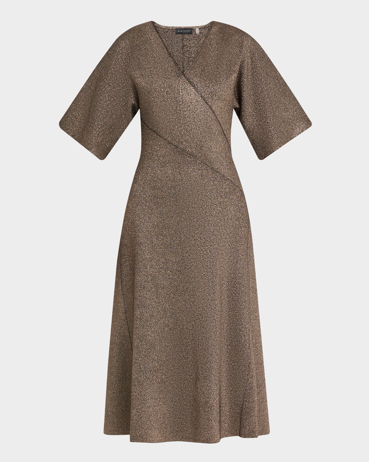 Elie Tahari "Everly" Lurex® metallic knit dress features a crossover design V neckline Wide halflength sleeves; approx. 19.5"L Hem falls below the knee Aline silhouette Invisible back zip closure Viscose/nylon/polyamide/polyester Unlined Hand wash or dry clean Imported