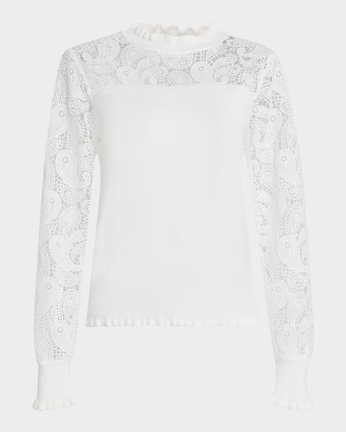 Elie Tahari "The Felicity" sweater with paisley crochet sleeves and yoke Approx. 23.5"L from shoulders to hem Crew neckline Long sleeves Ribbed ruffle cuffs and hem Relaxed fit Pullover style Viscose/polyester Unlined Hand wash or dry clean Imported