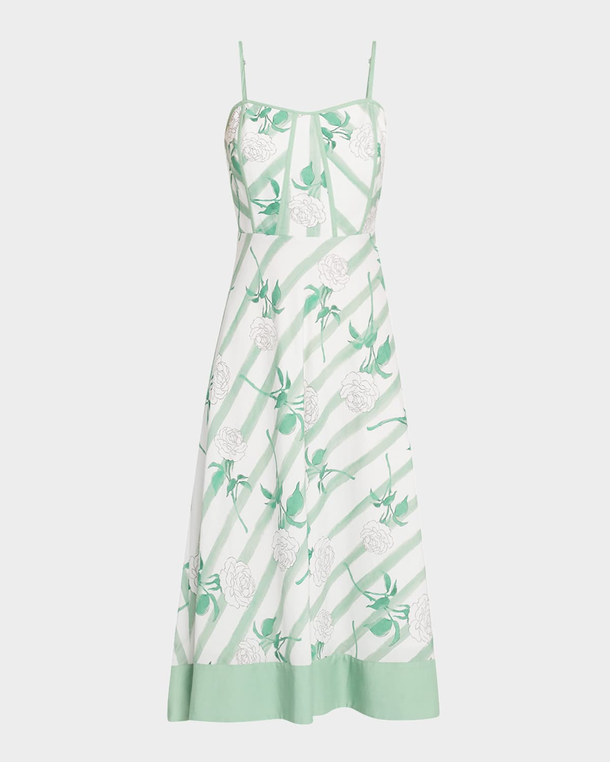 Elie Tahari "The Gia Liberty" midi dress printed with diagonal stripes and roses Approx. 49"L from shoulders to hem Scoop neckline Sleeveless Adjustable straps Smocked back Hem falls below the knee Aline silhouette Zip closure Tencel® lyocell/linen Lining: Cotton Dry clean Imported