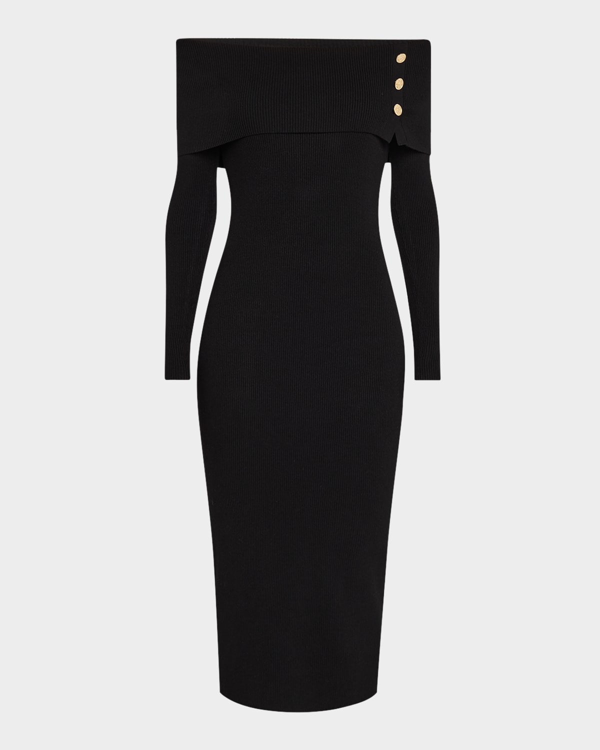 Elie Tahari "The Imani" midi sweater dress with decorative buttons Approx. 44.5"L from shoulders to hem Offtheshoulder foldover neckline Long sleeves Hem falls below the knee Bodycon silhouette Slipover style Viscose/polyester Unlined Hand wash or dry clean Imported