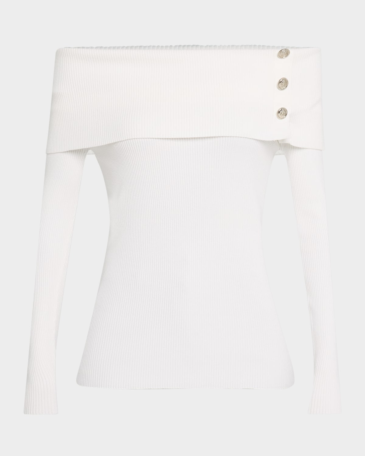 Elie Tahari "The Imani" ribbed sweater with decorative buttons Approx. 21.5"L from shoulders to hem Offtheshoulder foldover neckline Long sleeves Slim fit Pullover style Viscose/polyester Unlined Hand wash or dry clean Imported