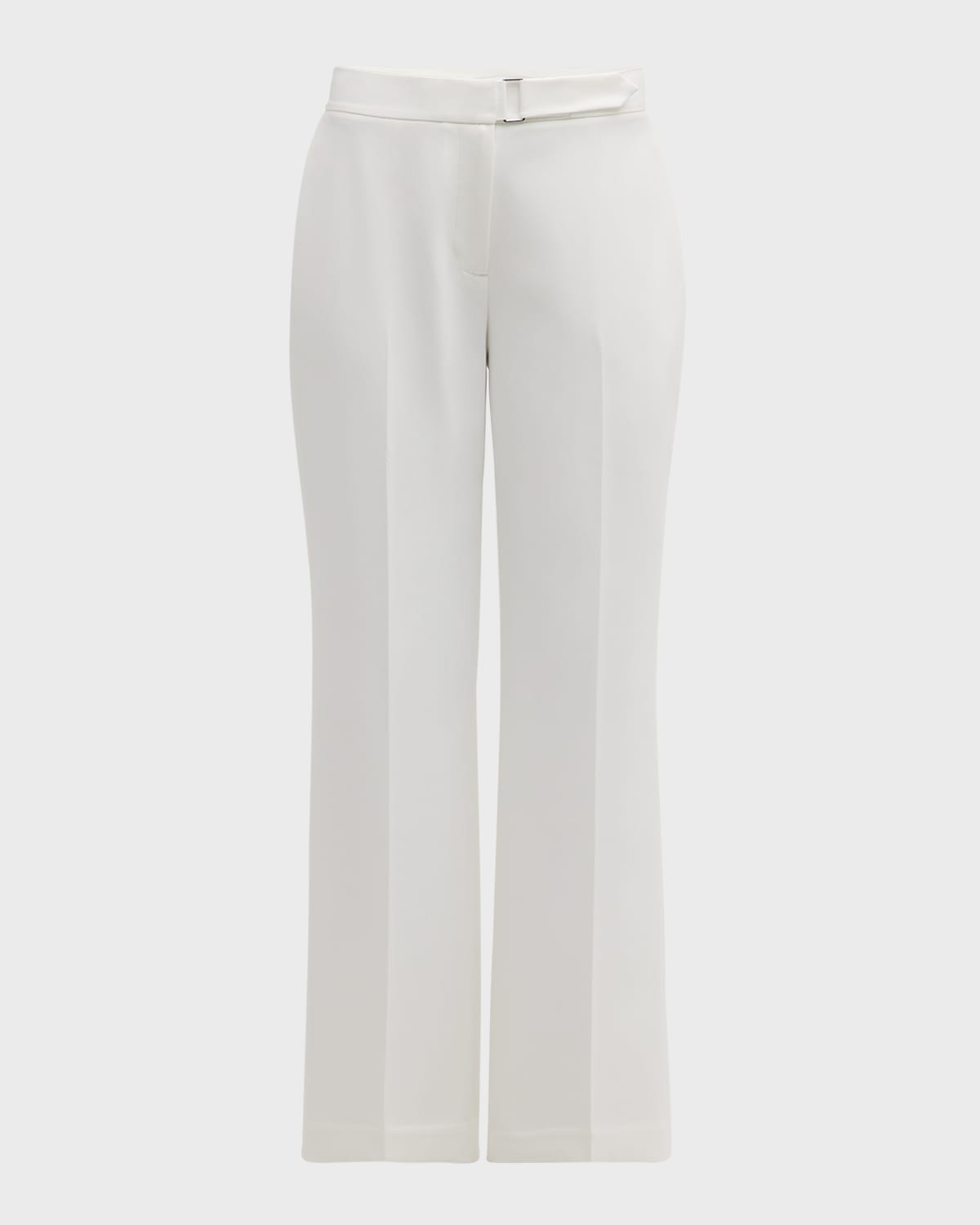 Elie Tahari "The Laylee" pants with pressed pleats and metallic buckle detail Approx. measurements: 31"L inseam; 41"L outseam Midrise sits high on the hips Flat front Full length Straight legs Extended tab/zip fly Polyester/elastane Lining: Polyester Machine wash cold Imported