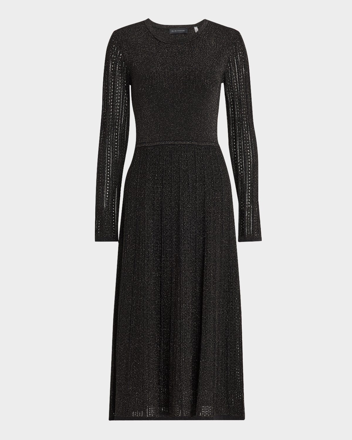 Elie Tahari "Madi" shimmery Lurex® sweater dress framed by lace stitched sleeves Approx. 45"L from shoulder to hem Crew neckline Long sleeves; approx. 24.0"L Hem falls below the knee Aline silhouette Slipover style Viscose/nylon/polyamide/spandex Unlined Hand wash or dry clean Imported