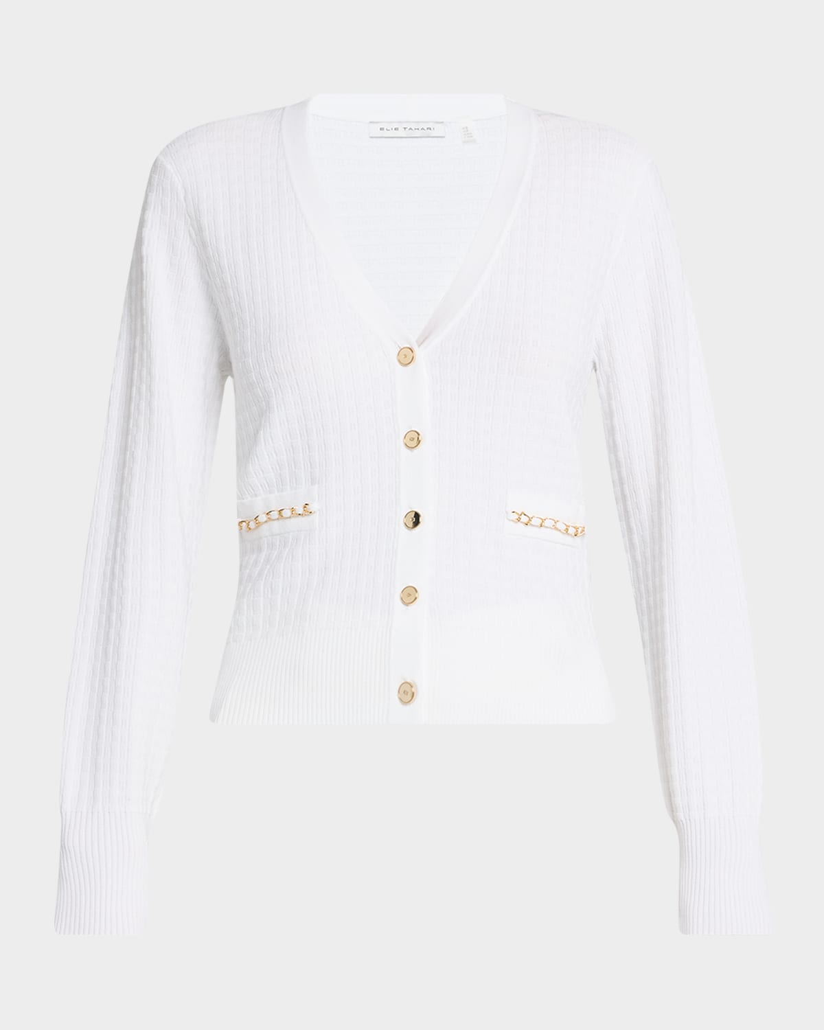 Elie Tahari "The Oaklee" textured knit cardigan sweater with chainembellished trim Approx. 20.5"L from shoulders to hem V neckline; button front Long sleeves Relaxed fit Viscose/nylon/polyamide/polyester Unlined Hand wash or dry clean Trim: Metal Imported