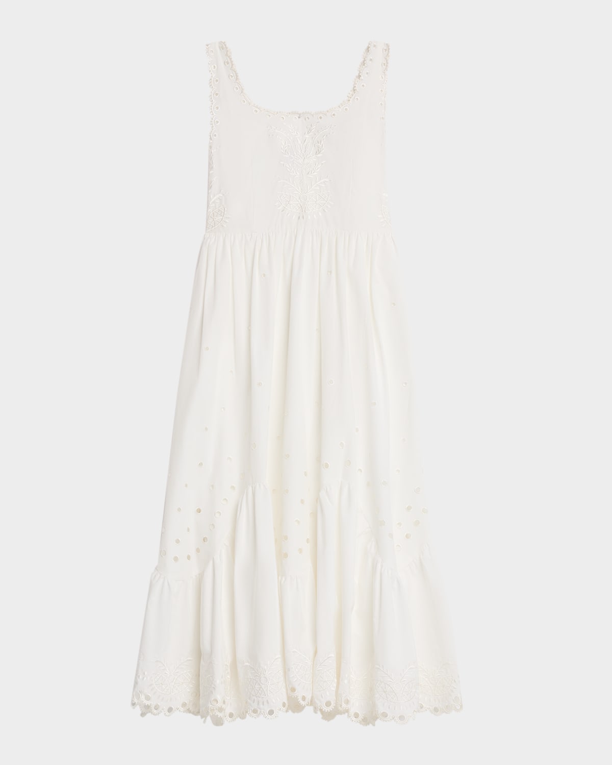 Elie Tahari "The Piper" scalloped midi dress embellished with floral embroidery and eyelet cutouts Approx. 54"L from shoulder to hem Scoop neckline Sleeveless Flounce ruffle hem Ankle length Aline silhouette Invisible side zipper Cotton/polyester Lining: Polyester Dry clean Imported